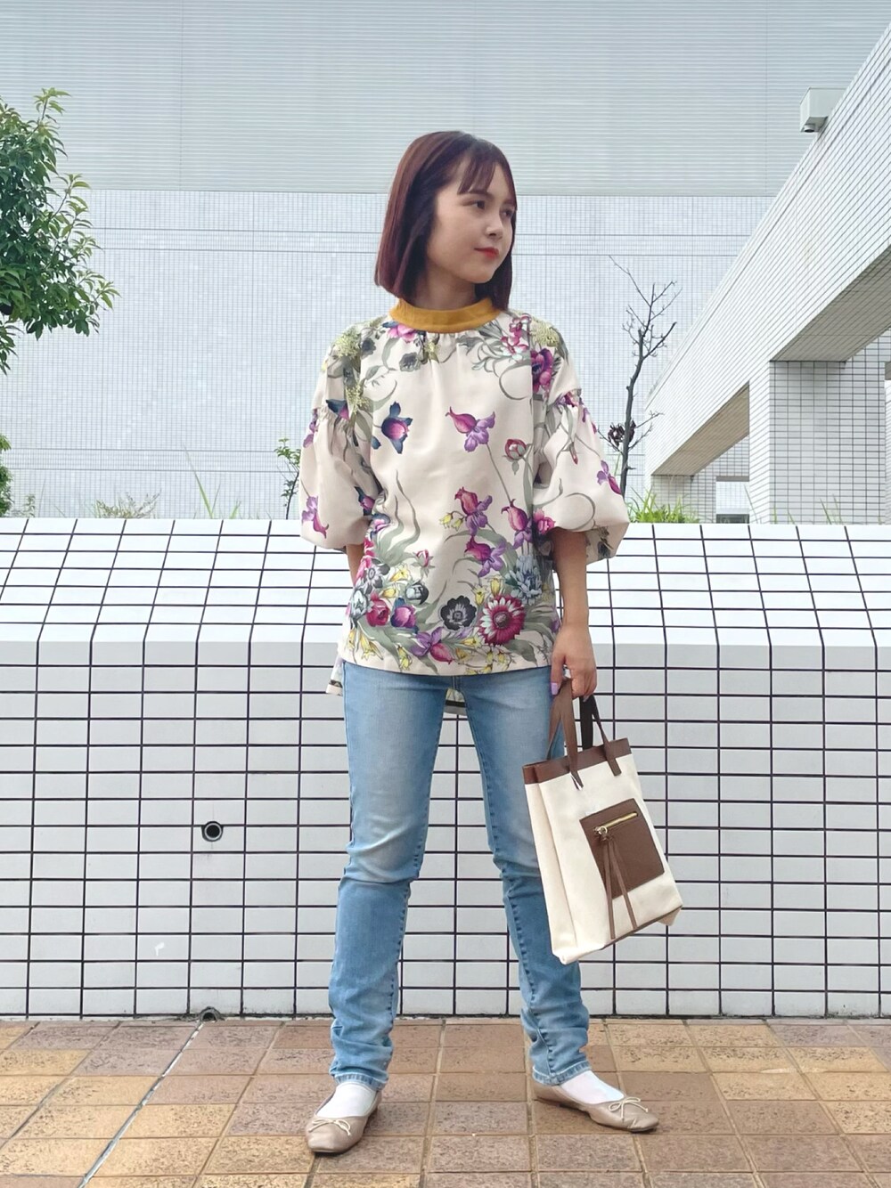 🌷フラワープリント🌷 秋の花がプリントされたブラウスを、デニムと合わせて 大人カジュアルなコーディネートにしました(^o^)