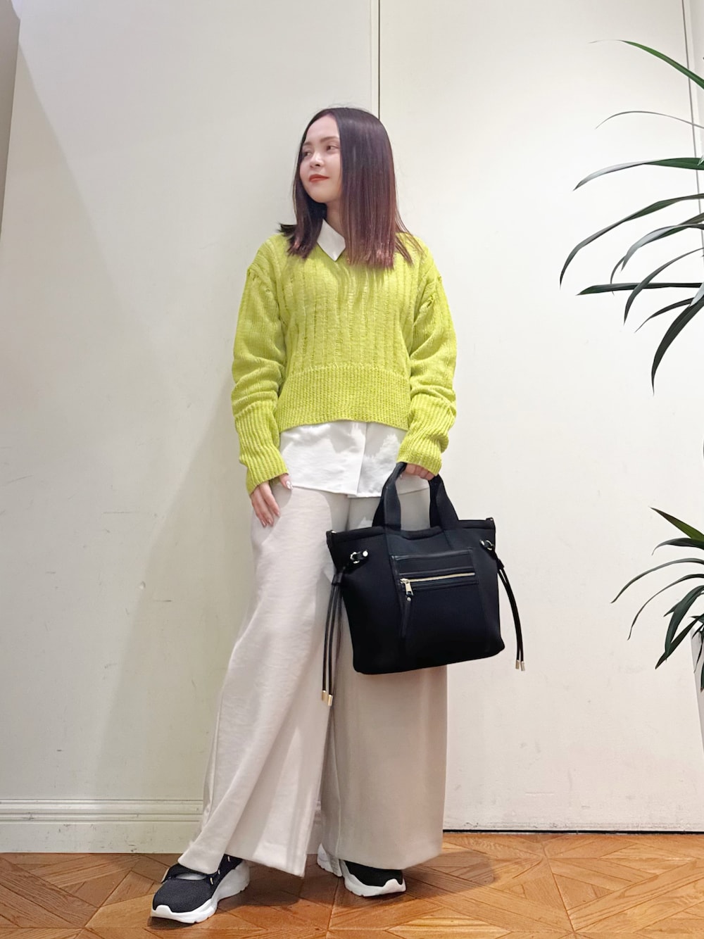 グリーンのメッシュニットをメインに、他のアイテムはベージュ系でまとめました☺︎ メッシュニットはショート丈なので、インナーに長めのシャツやタンクトップを合わせたレイヤードコーデもオススメです◎