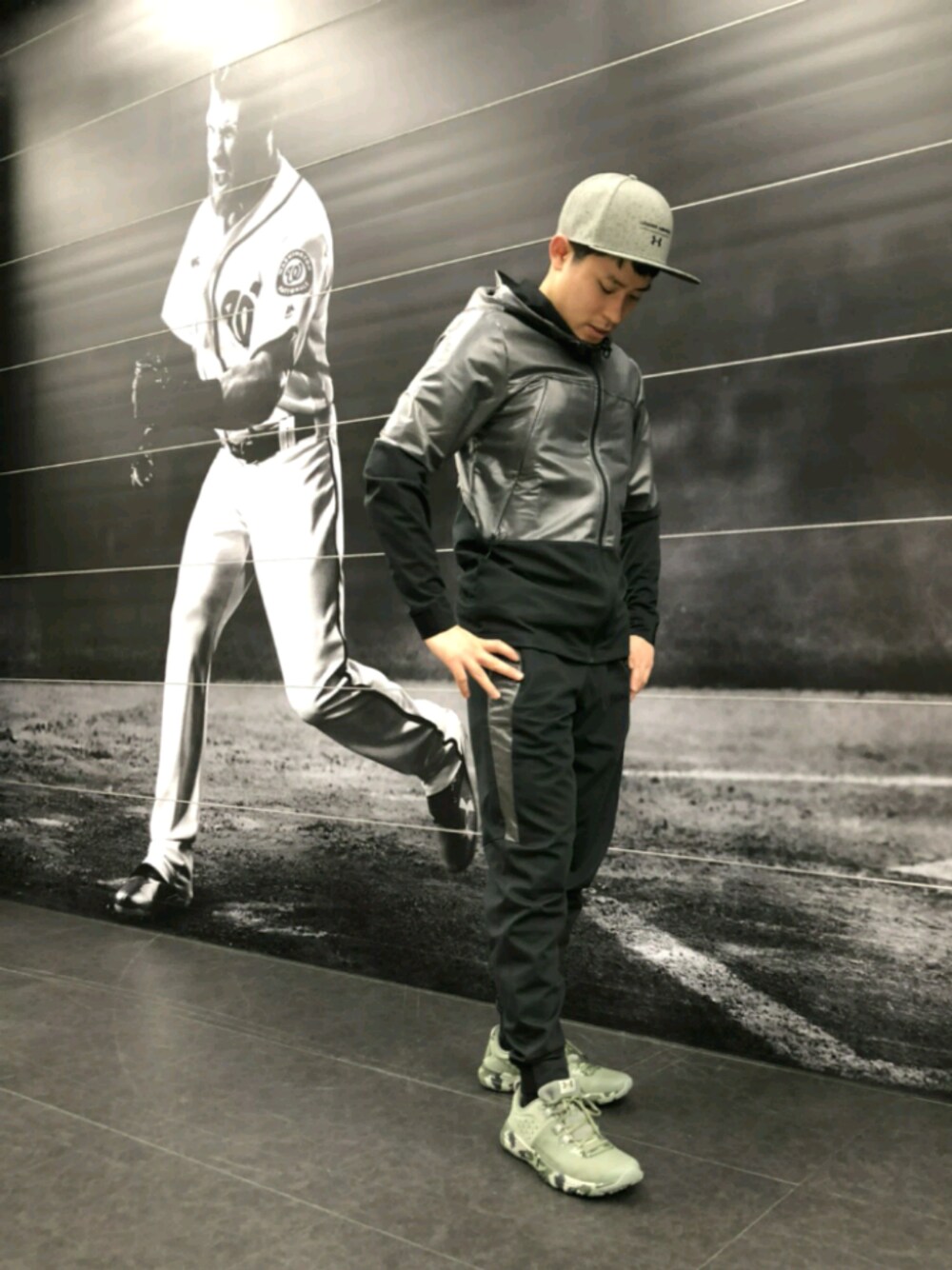 ある日のトレーニングスタイル。 動きやすい上下のセットアップに迷彩柄シューズ。 アンダーアーマー、機能性はもちろん、見た目もサイコー!