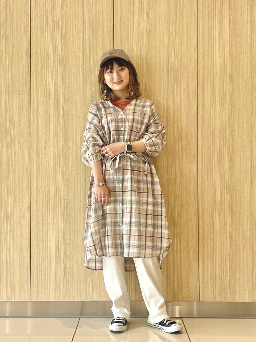シャツワンピコーデ🧸🌼ベージュチェックのシャツワンピが主役!!程よい透け感がかわいい〜❤️袖は五分か七分くらいの長さで丸みのあるふわっとした作りになっています🌼さらさらの生地が気持ちよくて、夏まで着られそうです👌🌈ボトムスはカットリプパンツ✨お腹もゴムで楽ちん💗生地も伸び伸びなストレッチで楽ちん💗楽ちん揃いなのに合わせるだけでおしゃれ感の出る生地感!おすすめです💖 普段レディースMサイズの私で、トップスMサイズ、ボトムスMサイズを着用しています🐶