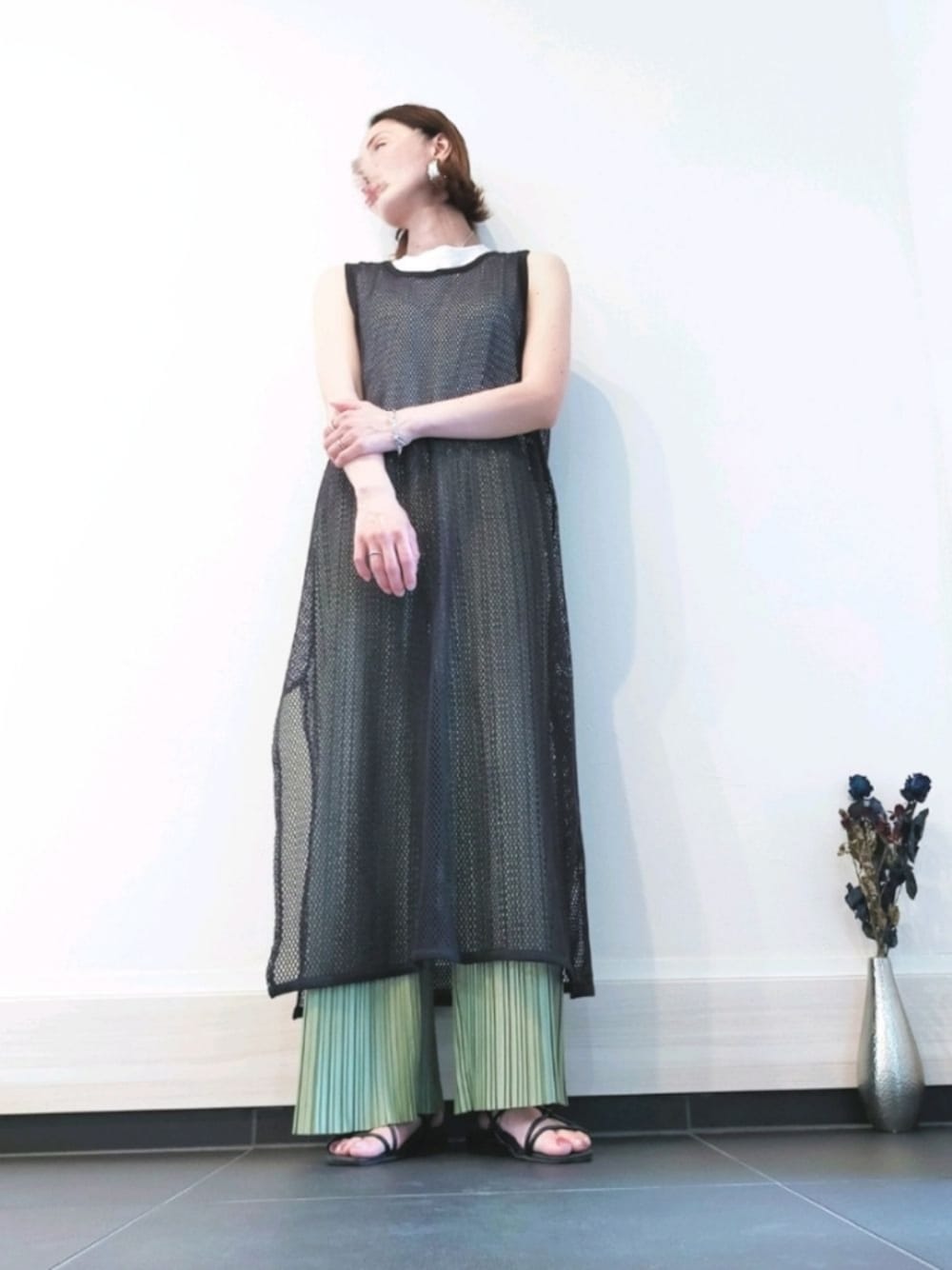 ニコアンドのあみあみタンクトップワンピースを着ることによって、小洒落た感がでてとてもオススメです!
