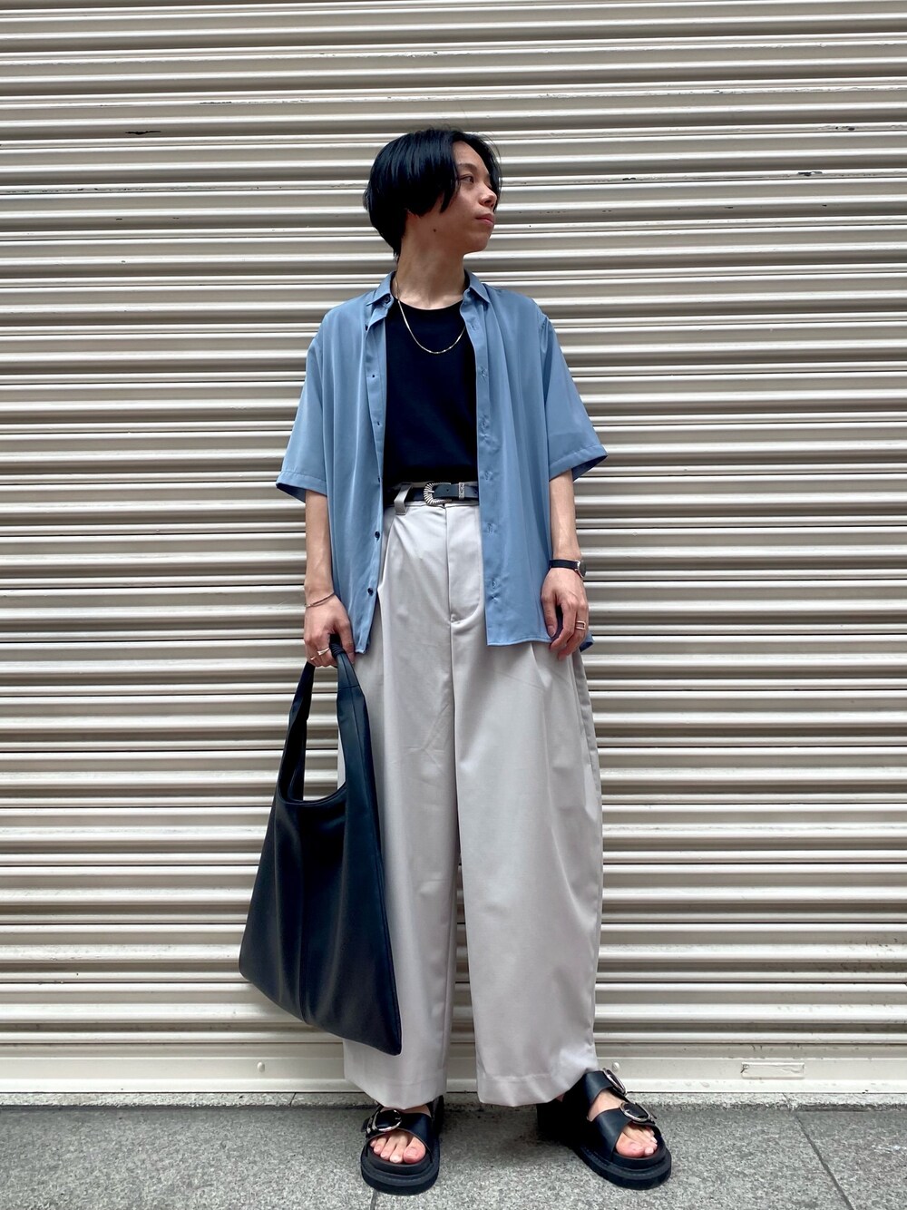 爽やかラフコーデ 今年の夏、ブルーのシャツは必要アイテム! ワイドパンツでラフに合わせるのがいいね! トップスS インナーS パンツS サンダルM