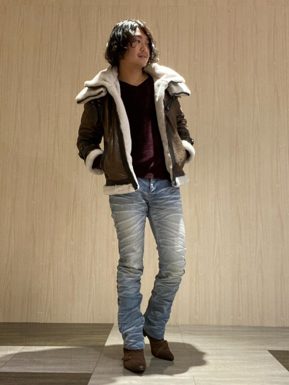 マルイシティ横浜店島田です✨ 真冬のボンバージャケットコーデです❕ 表地はゴートレザーを使い、裏地はモコモコフワフワなボアを使用してるので真冬でもかなりあたたかく着ていただけます。 インナーは定番モールヤーンの新色に秋冬には珍しい明るいトーンのデニムで合わせました。 デニムはトルネードマートらしいヒゲ感の強い新作デニムです。 小物もポインテッドのブーツで全体的にトルネードマートらしいワイルドなスタイリングにしてみました!