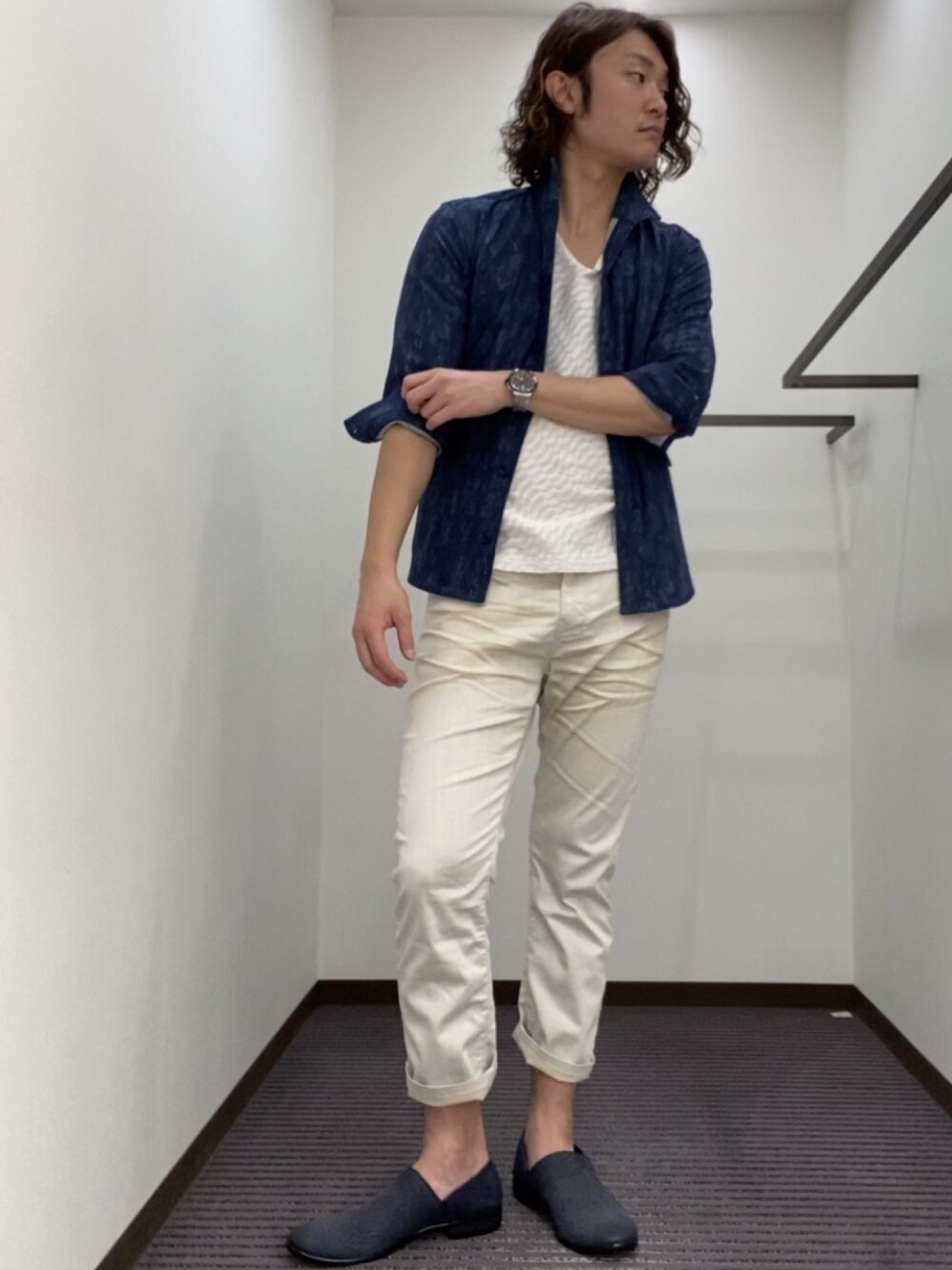 【定番☆】 人気のハイテンション素材のシャツがパワーアップしましたー✨ 今期のデザインは生地が薄くなり、柄も程よくさり気ないデザインになっています❕ スタイリングとしてはシャツの存在感を出すため、パンツとインナーはベージュと白で合わせ、足元と統一感を出してみました❕
