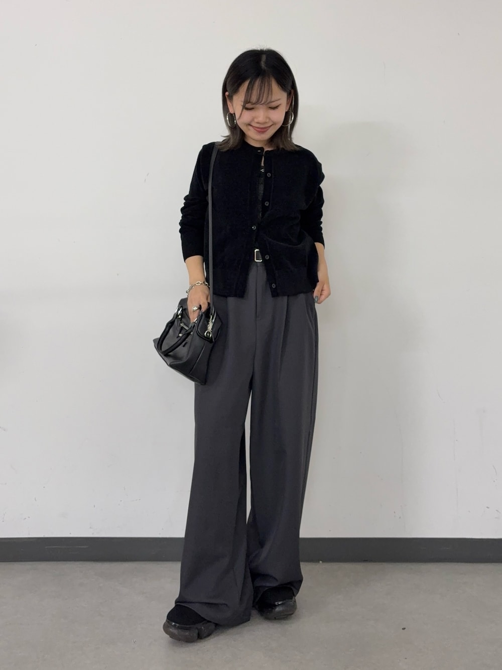 コーデをご覧いただきありがとうございます ☺︎ 【cardigan】着用サイズ:FREE なめらかな光沢とふんわりとした質感が魅力のベロアモール素材を使用したクルーネックカーディガンです。 しっとりとした肌触りで着心地も抜群。 ボタン開けて羽織りでも、閉じてトップスとしてもお使いいただけます◎ 【bottom】着用サイズ:S 腰まわりにゆとりをもたせるワンタック仕様で、気になるラインをカバーしながらすとんと落ちるワイドシルエット ほどよく厚みと落ち感のある生地が、脚のラインを拾わずきちんと感のある上品な印象を与えてくれます◎ 【bag】着用サイズ:FREE コンパクトな見た目ですが、見た目以上に大容量◎ メイン収納はマグネットボタン×2、ジップ×1の合計3つに分かれているので整理しやすい構造に二重に ショルダー部分は6段階で長さ調整可能なので肩掛けも斜め掛けも可能です!