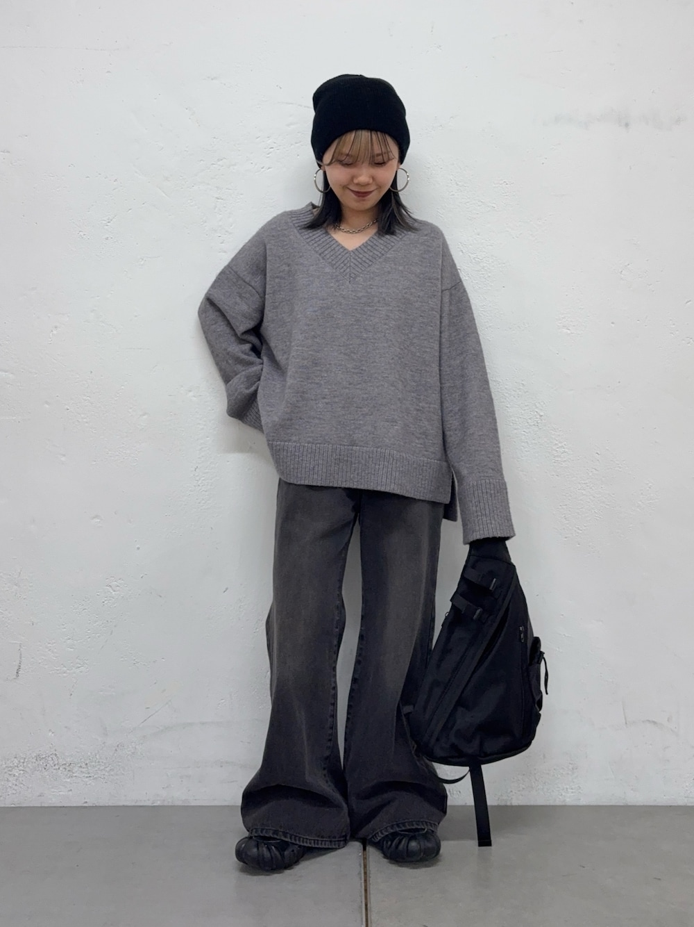 【knit】着用サイズ:FREEふんわりと柔らかい万能ニット ポイントはVネックなので一枚で着てもレイヤードとしでシャツやタートルニットと合わせるのも可愛いです🖤 【bottom】着用サイズ:PS 低身長さんのお悩みに特化した神シルエットデニム✨ 4サイズ展開なので身長問わず着用可能です◎ 2段階ウエスト調節できるボタン付きでベルト要らずが叶う、イマドキ感あるワイドフレアなシルエットです🖤 【bag】着用サイズ:FREE 男女問わず着用いただけるバッグです。 撥水性に優れた高機能素材を使用しており、外側に3つ、内側に1つ収納ポケットを設け利便性にも◎ カナビラやストラップなどをつけて自分らしくアレンジするのも可愛いです🫶
