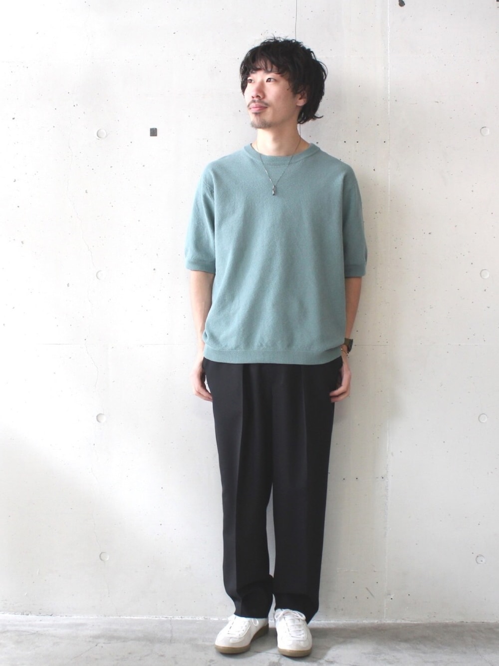 ミントグリーンが春らしいコーディネート 今年はパステルカラーが気になります SLICK コットンニット markaware クラシックフィットパンツ reproduction of found ジャーマントレーナー maison martin margiela ネックレス