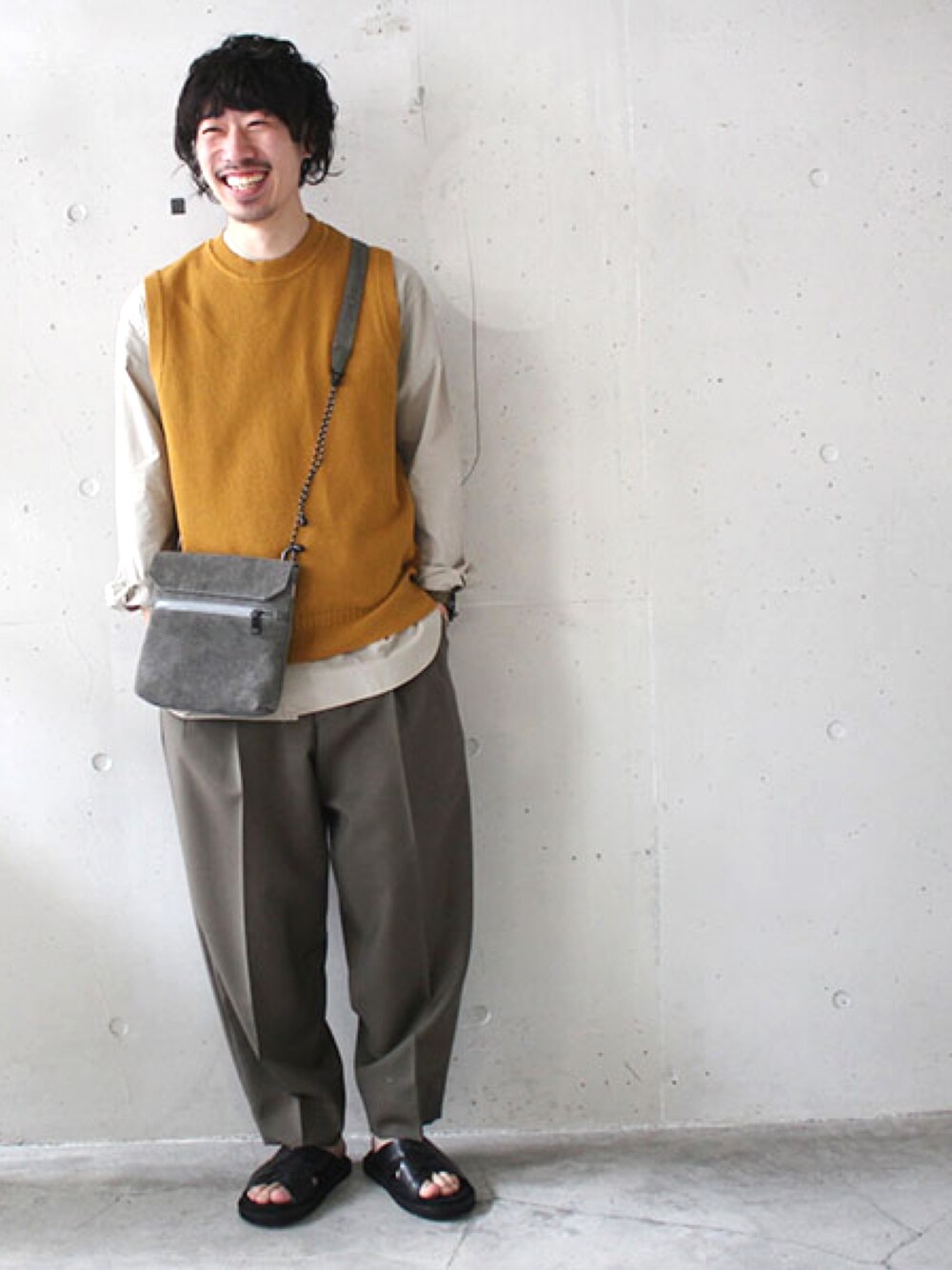 春から夏に移り変わっていく間のコーディネート 夏物と春物をミックスさせたコーディネートができるのは今だけで楽しい! STILLBYHAND ニットベスト STILLBYHAND ノーカラーシャツ marka ワンタックウールスラックス BUTTERO レザーサンダル AS2OV スウェードサコッシュ