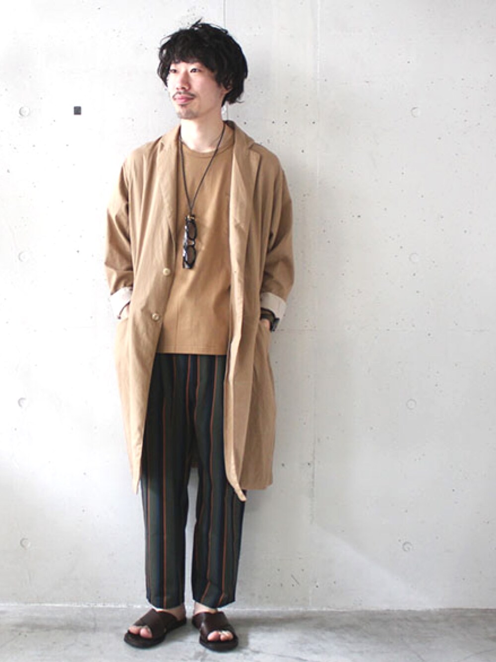 ベージュのトーンコーデ 薄着でも重ね着を楽しめるアイテムはついつい手が伸びます。 今季は柄パンツがオススメ! SLICK リネンコート LaBarba クルーネックカットソー LaBarba 日向パンツ インポートサンダル レザーサンダル