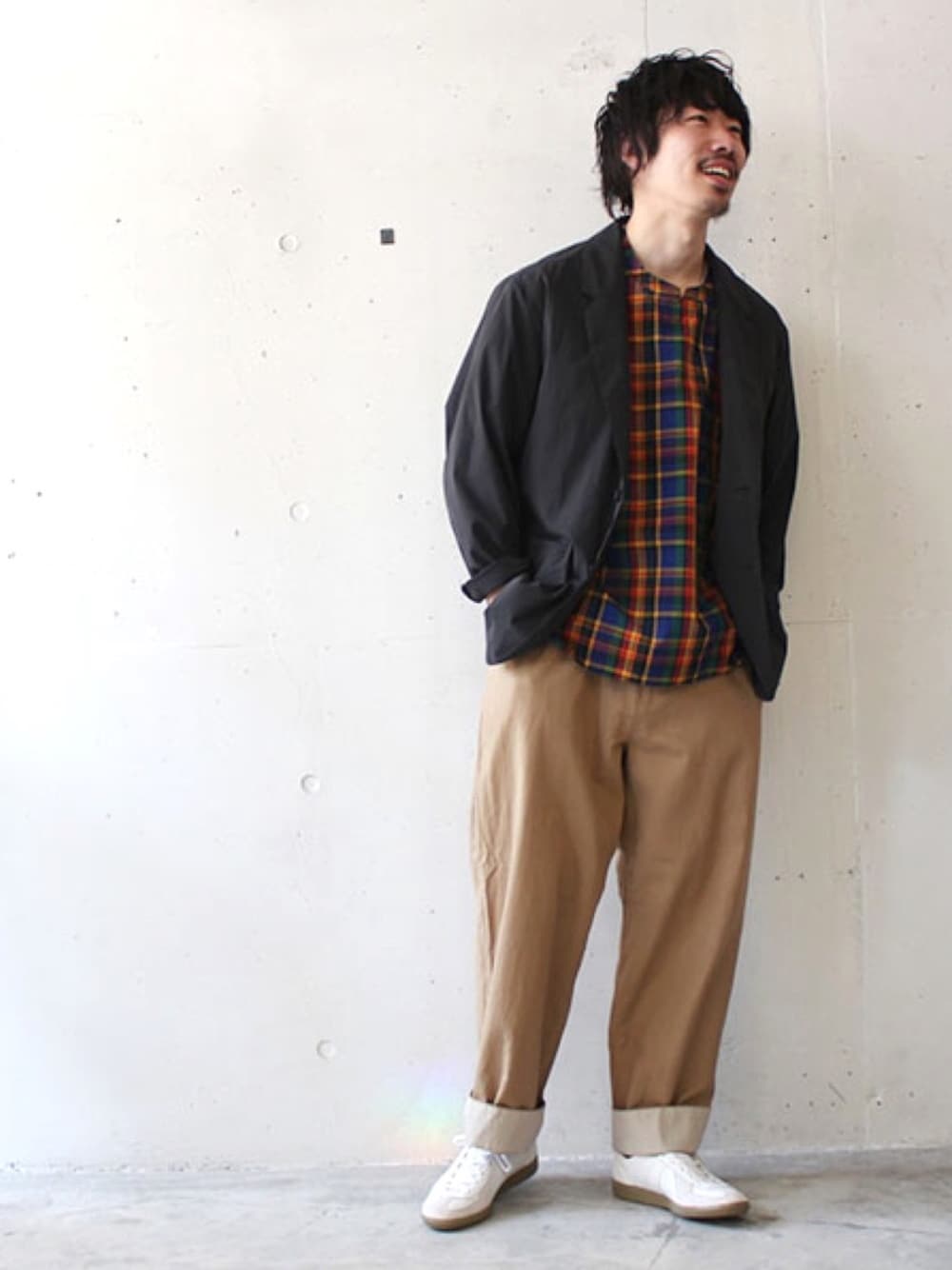 ジャネットスタイルをどう着崩すか。 今の気分は柄物ミックス! 08sircus テーラードジャケット white mountaineeing チェックT SLICK リネンワイドパンツ reproduction of found ジャーマントレーナー