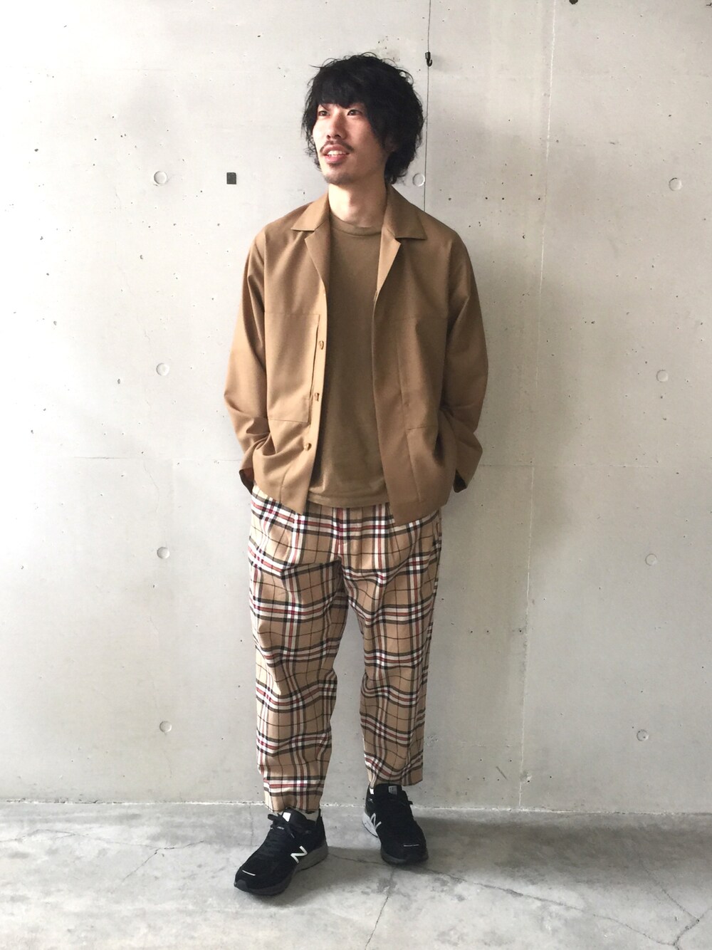 ベージュ大好き人間! ワントーンも好きだけど 足元を黒で締めるのもあり🙆♂️ markaware シャツジャケット SLICK ドロップショルダーT SLICK イージーチェックパンツ newbalance 990V4