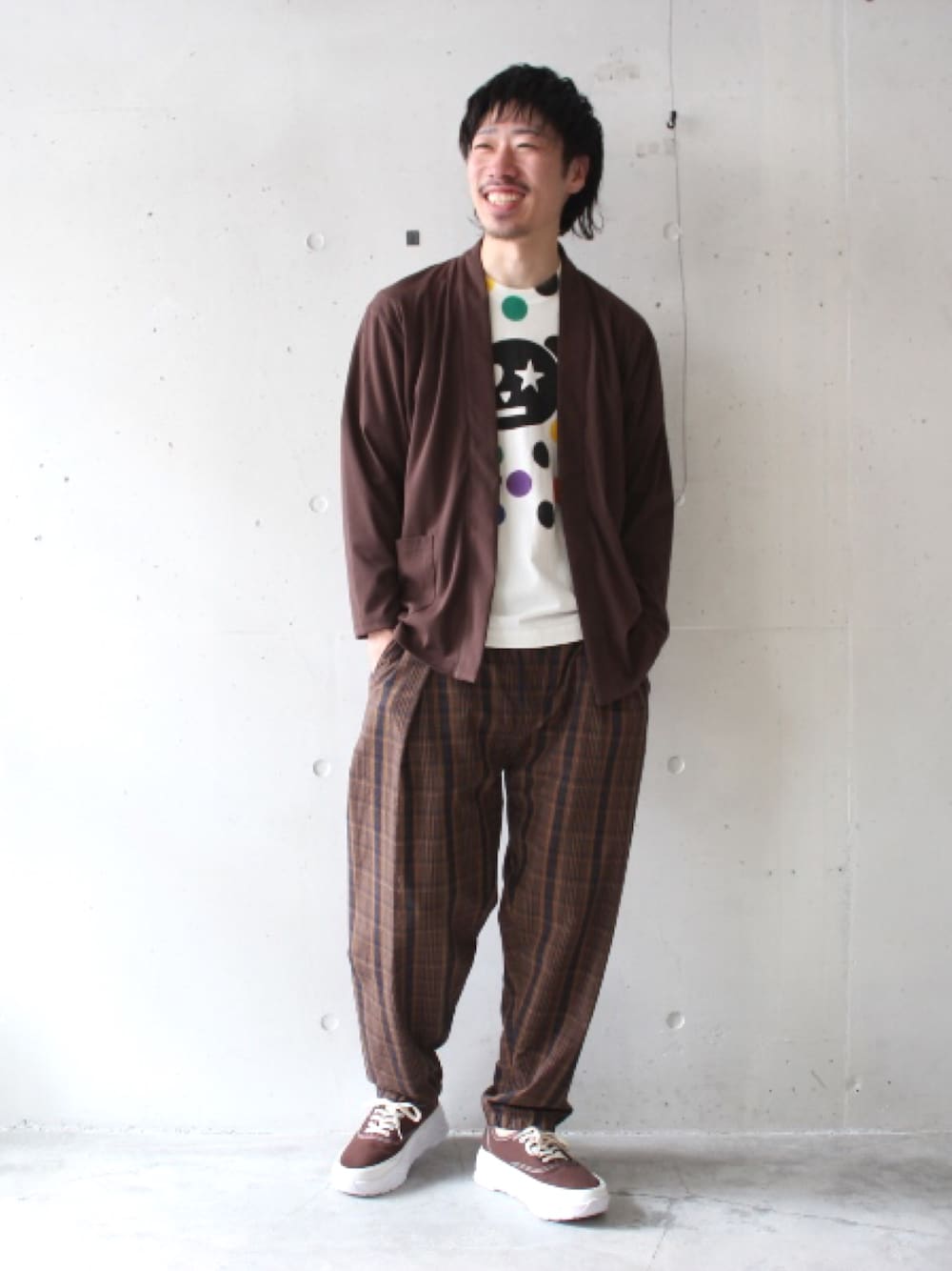 大好きな茶色で ブラウンコーデ🐻 Labarba 島国カーディガン プリントT brunaboinne EDOチェックパンツ brunaboinne ダットスニーカー marka