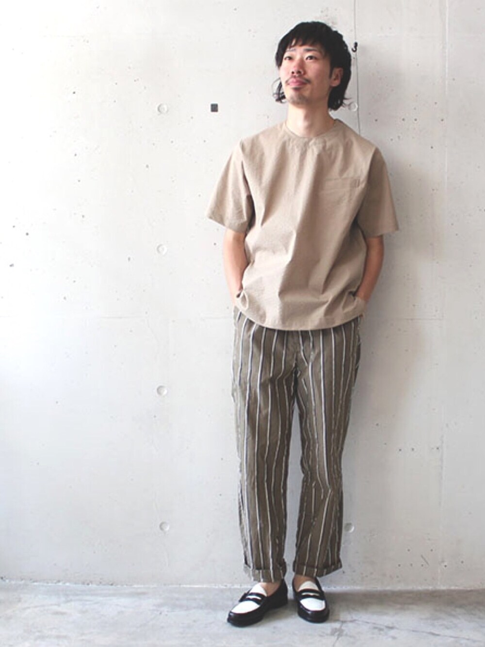 アースカラーコーディネート! 足元はジェダイカラーのローファー。 Bassのローファー履きやすくて良いな LaBarba そよかぜTシャツ stillbyhand ストライプパンツ G.H.Bass コインローファー