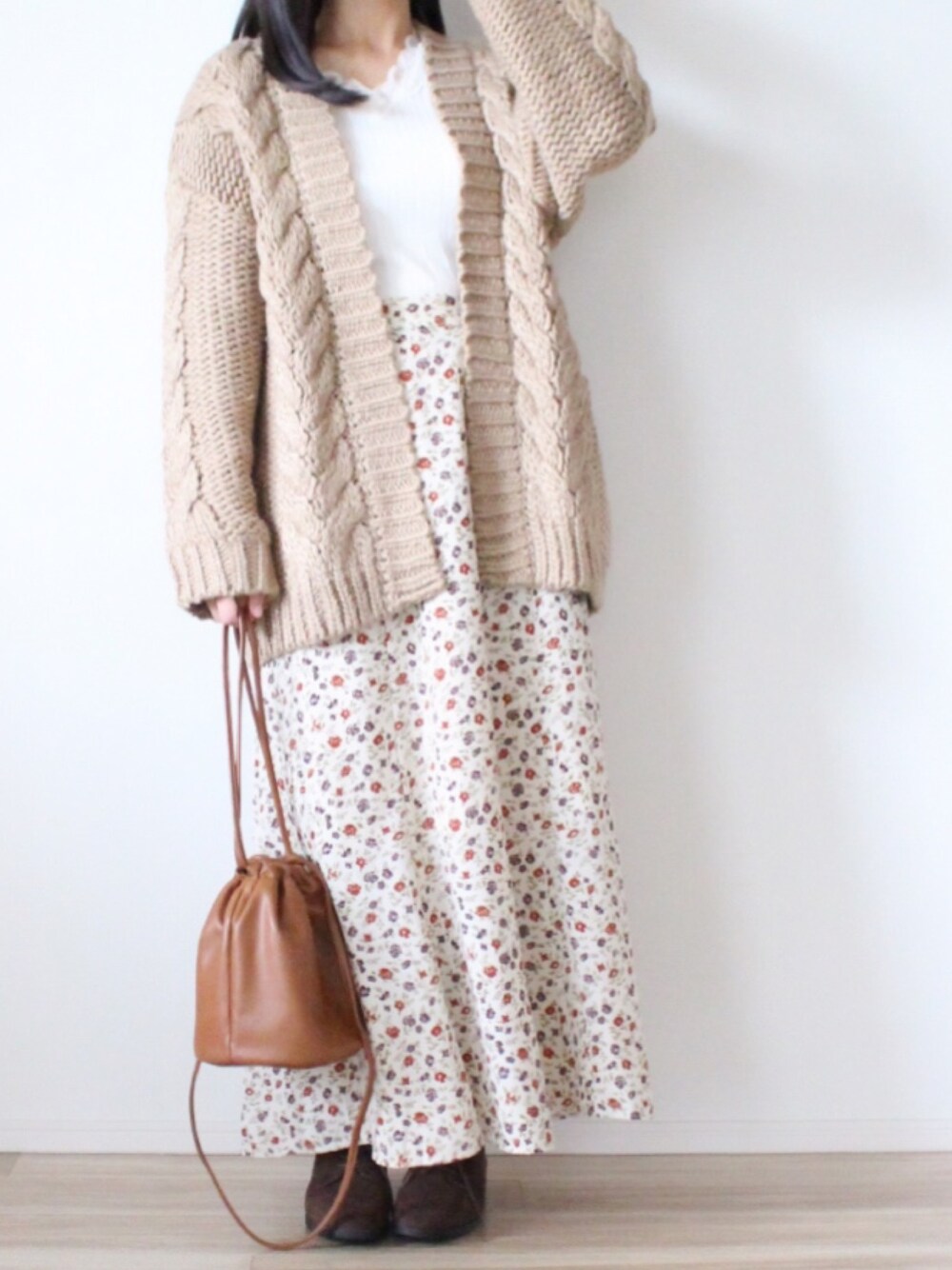 ケーブルデザインニット/カーディガン…titivate 襟レースアイレットテレコPO…¥980(品番521-6729) フレアロングスカート(フラワー)AM+E…¥1990 ドローストリングバッグ…¥1990(GU) オックスフォードシューズ…¥2490(GU) これからの季節にぴったりなあったかカーディガン✨ titivateのカーディガンは厚みがあって、ケーブル編みに惹かれました♪