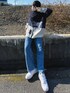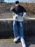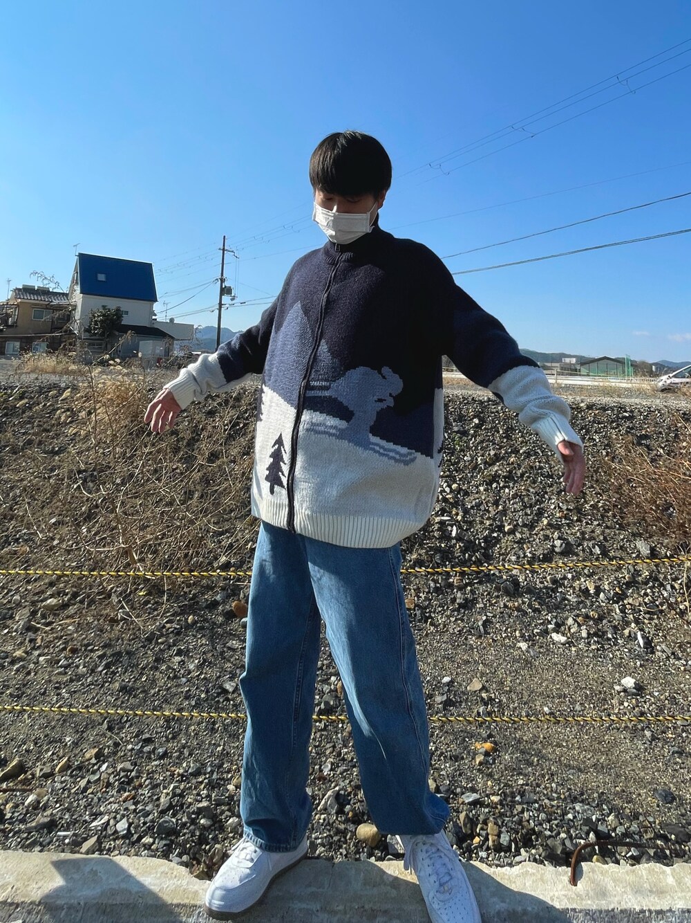 スキーしてる柄のニット🧶 色合いと風景が可愛すぎる👾 今日は淡いデニムと合わせてるけどスラックスにでもカーゴパンツでも何にでも合う! 特にお気に入りはホワイトパンツとの合わせ!