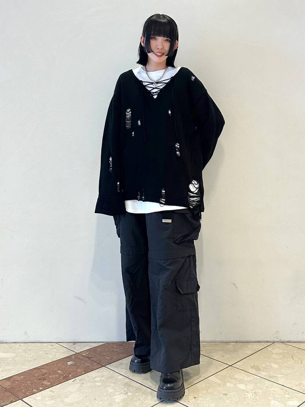 Hinechiさんアイテムコーデ🖤 本日はHinechiさんアイテムで王道モードストリートコーデです🐈⬛ トップスのゆるだぼ感×ダメージがドストライクに可愛すぎます(;_;) あえて2wayカーゴと合わせてストリート感マシマシで着用しています!🩶