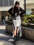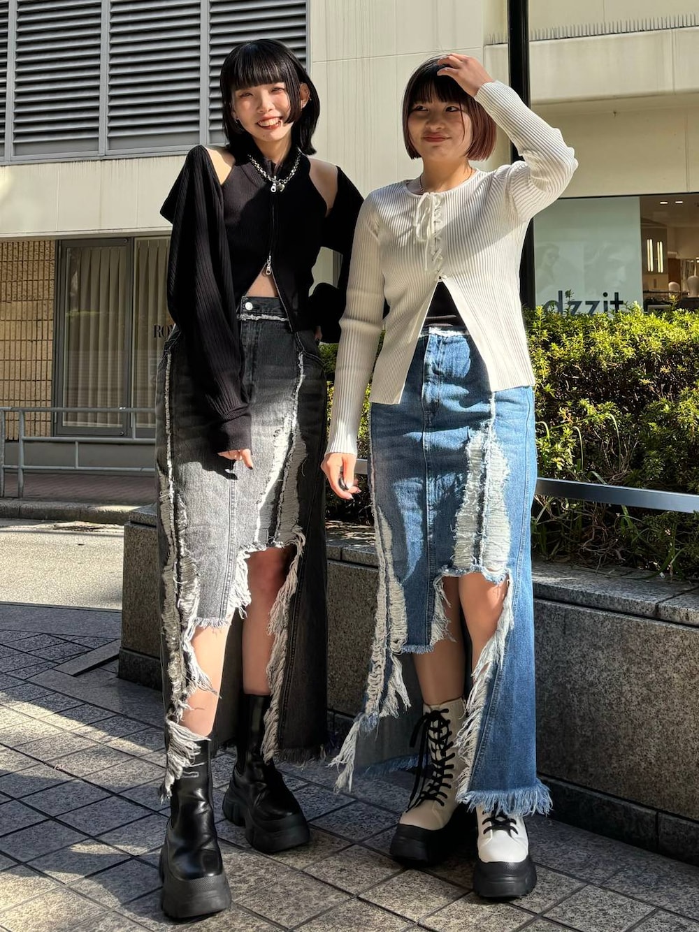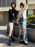 デニムスカート🦋 本日は大人気デニムスカートコーデです! しっかりダメージが入っているのでかっこいい系でもカジュアル系でも着られるデザインになっています! ダメージで膝上丈になっているので太ももの隠したいところはしっかり隠してくれるので美脚効果抜群です!🖤