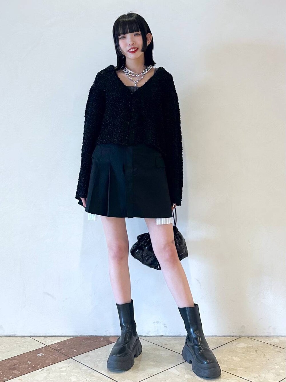 ペーパーヤーンショートカーディガン🖤 本日は新作のショートカーディガンコーデです! ペーパーヤーンというだけあって不思議な感触のカーディガンです!ショート丈なので足の長さはバッチリ盛れちゃいます🫶🏻