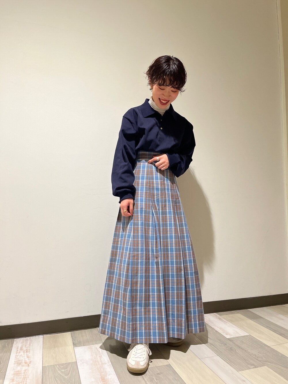 フレアスカートにポロシャツとスニーカーを合わせ、甘すぎないスタイルに。