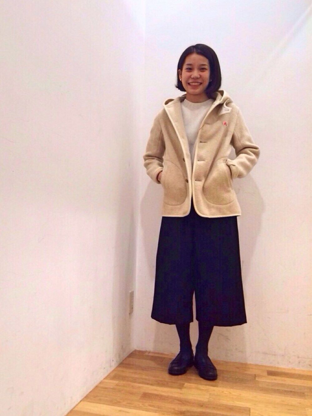 DANTONウールモッサーコートは着用していくたびに、からだに馴染みとても着心地のよい一着です。 暗くなりがちな秋冬のコーディネートに柔らかな印象をあたえる新色のカラーが登場致しました!黒のガウチョパンツに足もとは革靴でカジュアルさを抑えたコーディネートです。