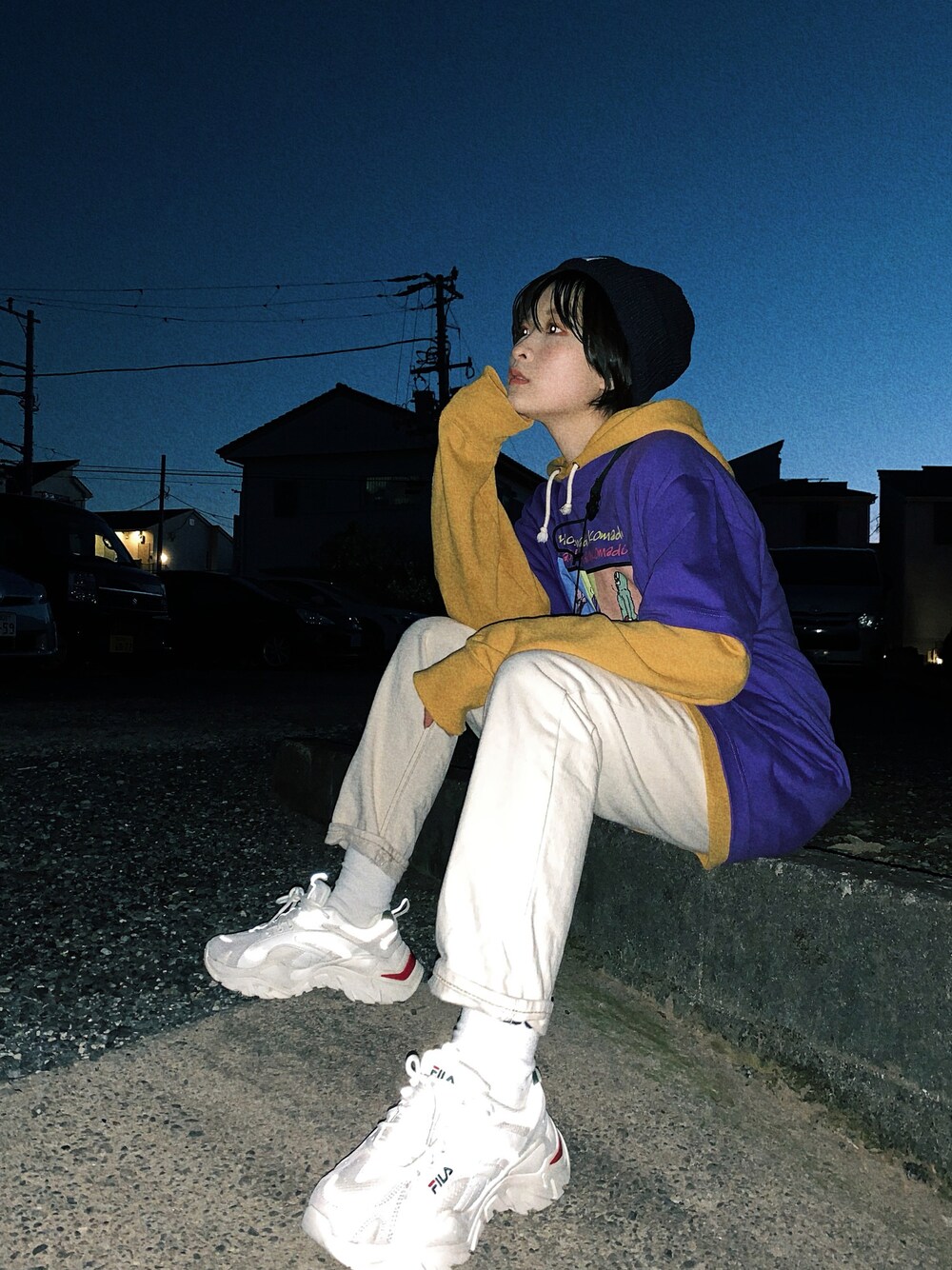 Tシャツ×パーカーで💓 黄色と紫の組み合わせも最高にストリート感が出ますよね😌
