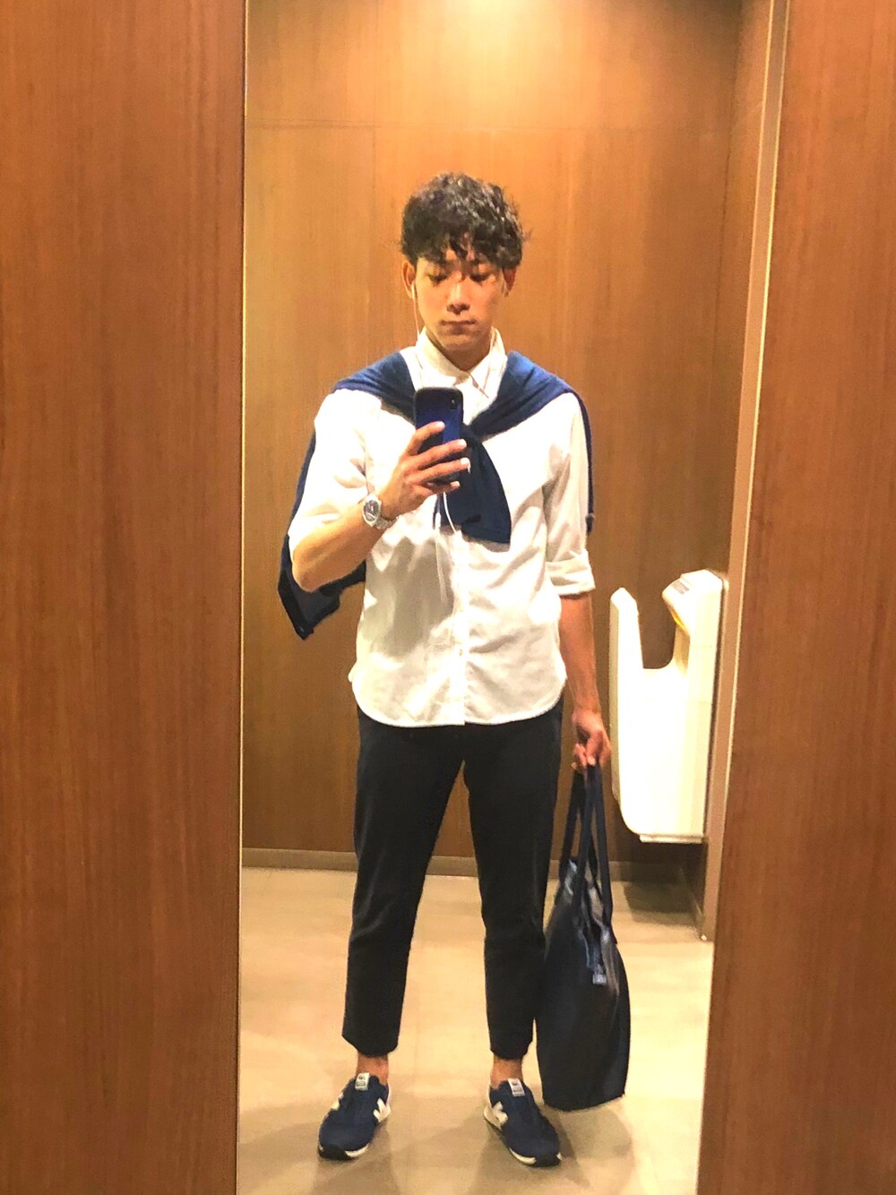 Home workスタイル! パーマの遊びをキレイめでカバー してます! 意識したのコーディネートに被りが 出ないように珍しいNBの 紐なしスニーカー着用してます! アドバイス等よろしくお願いします( .. )