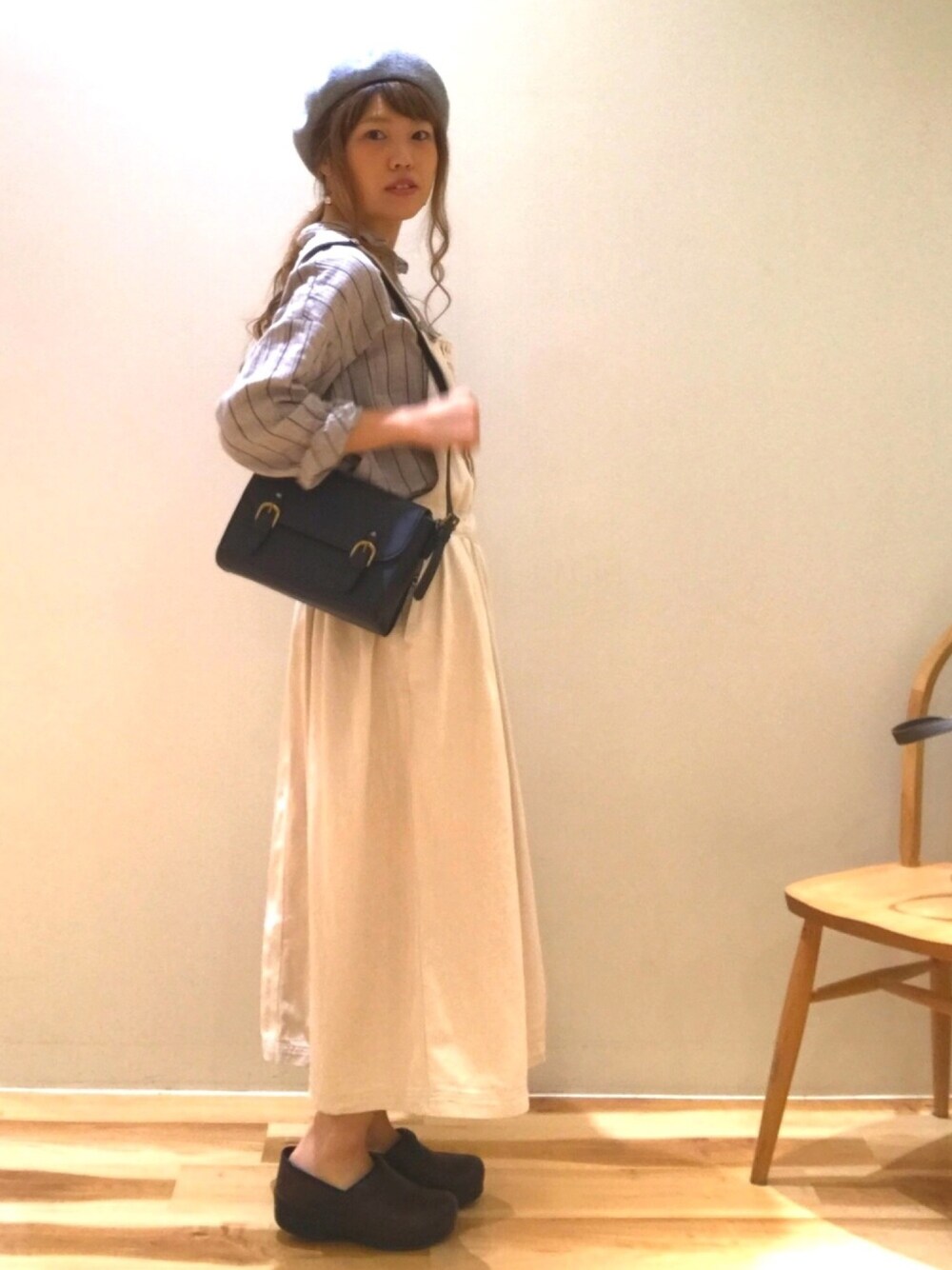ジャンスカもシャツとショルダーバッグで大人ナチュラルに着こなせます。 実はウエストが絞れるのが、嬉しいポイントです。