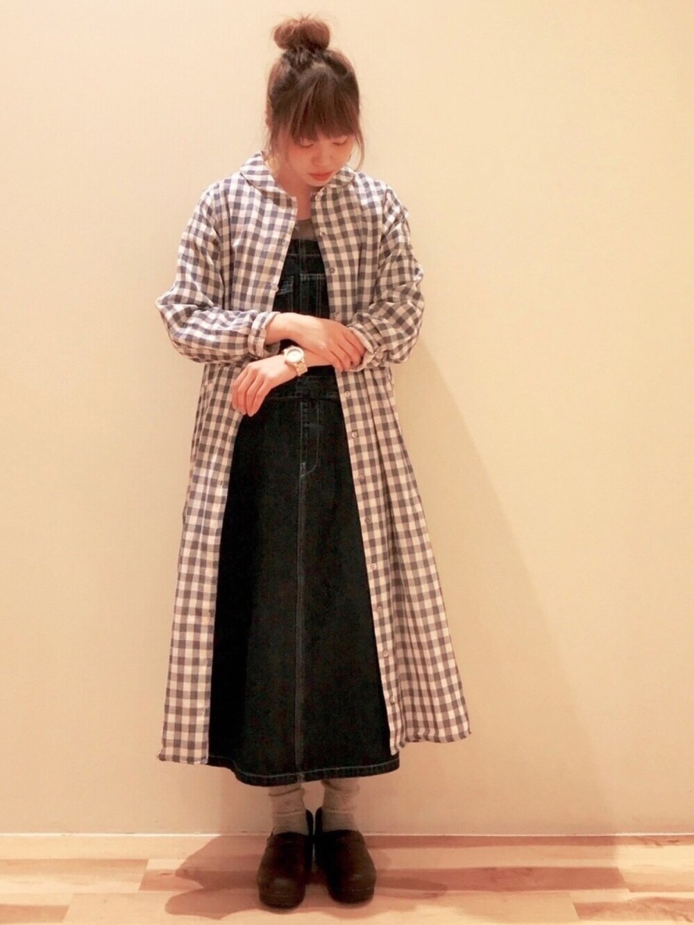 デニムのジャンスカに、春らしいギンガムチェック柄のワンピースを羽織りました。 ワンピースは軽い生地なので、重ね着しやすく着まわしに役立つオススメアイテムです。