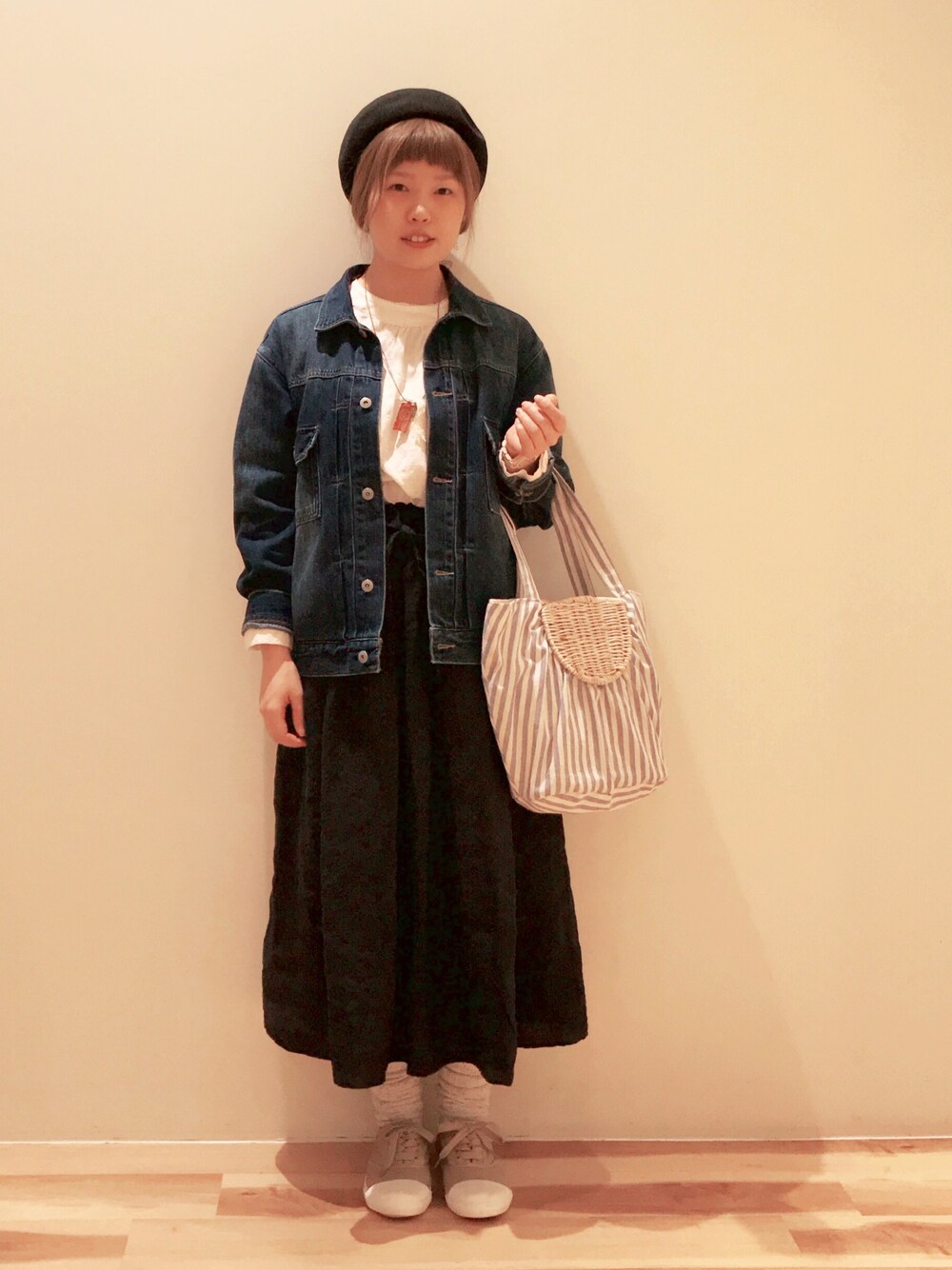 つい最近、電車に長く乗って移動する日に実際に着たコーデです。(小物以外) アウターは、ロングコートにすると座席に座ったときにしわにならないか気にしてしまうので、Gジャンにしました。 ブラウスは前回のコーデのものを着まわしています。 足元は動きやすいスニーカー。旅行で「たくさん行動するぞ!」という時にも履きたくて、色はベージュにしました。(白はどうしても汚してしまうのです。。。) 動きやすさを意識して選んだので、まだ早いですが、お花見コーデにもいいかなと思ってます。 ☆スカートの詳細は後日更新します