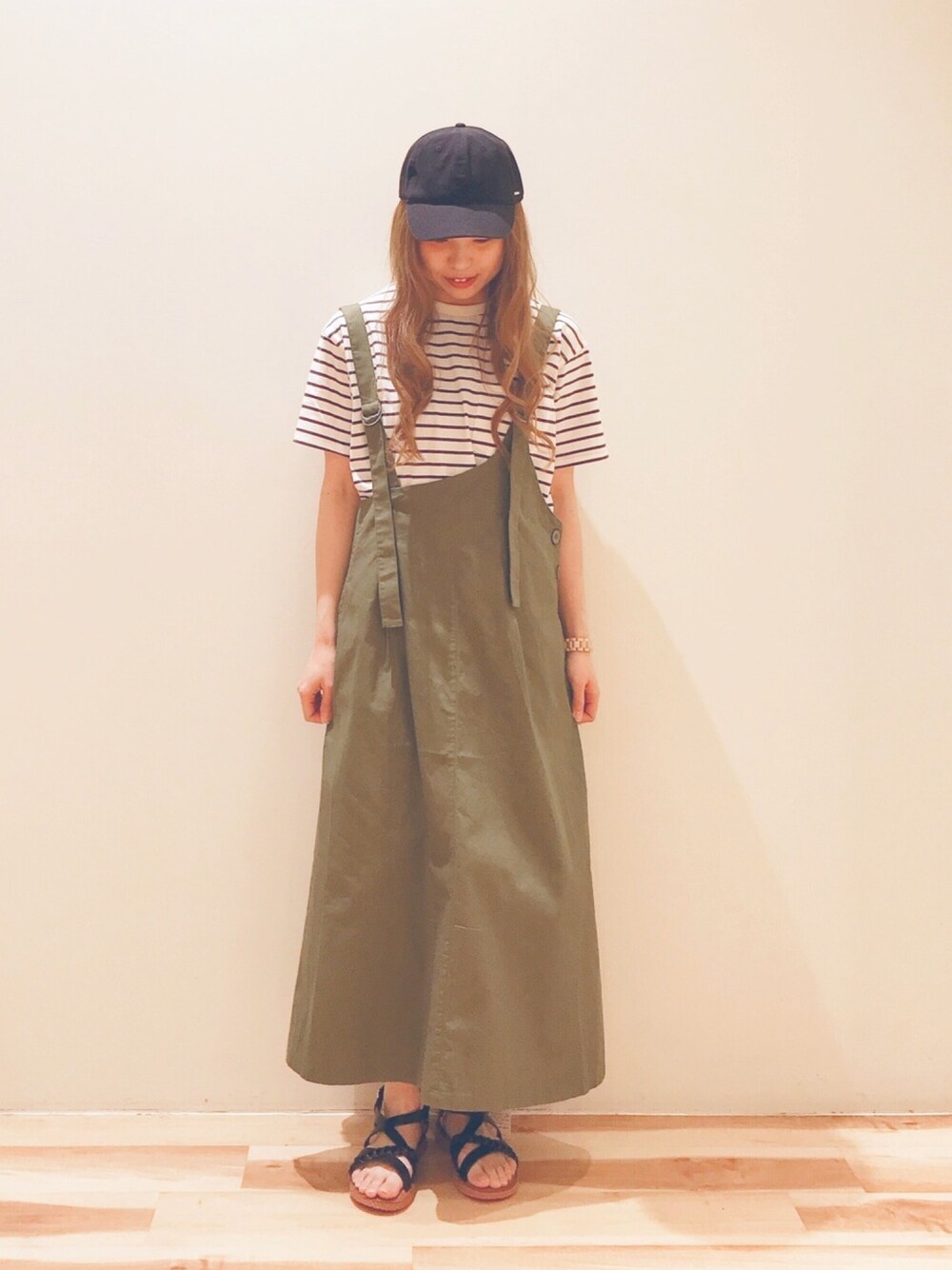 Samansa Mos2 blue のカジュアルコーデ。 アシメなデザインが面白いジャンスカは、ワンショルダーにもなります。(右肩紐が取り外し可) ジャンスカは子供っぽくなってしまう…と思っていた方には特にオススメしたい大人なジャンスカです!