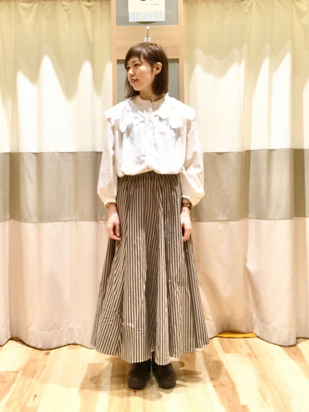 つけ襟をさり気なーく取り入れたコーデです。 合わせたストライプ柄スカートはウエスト周りにボリュームが出にくく裾への綺麗なラインが特徴で、尚且つ動きも出てオススメです。