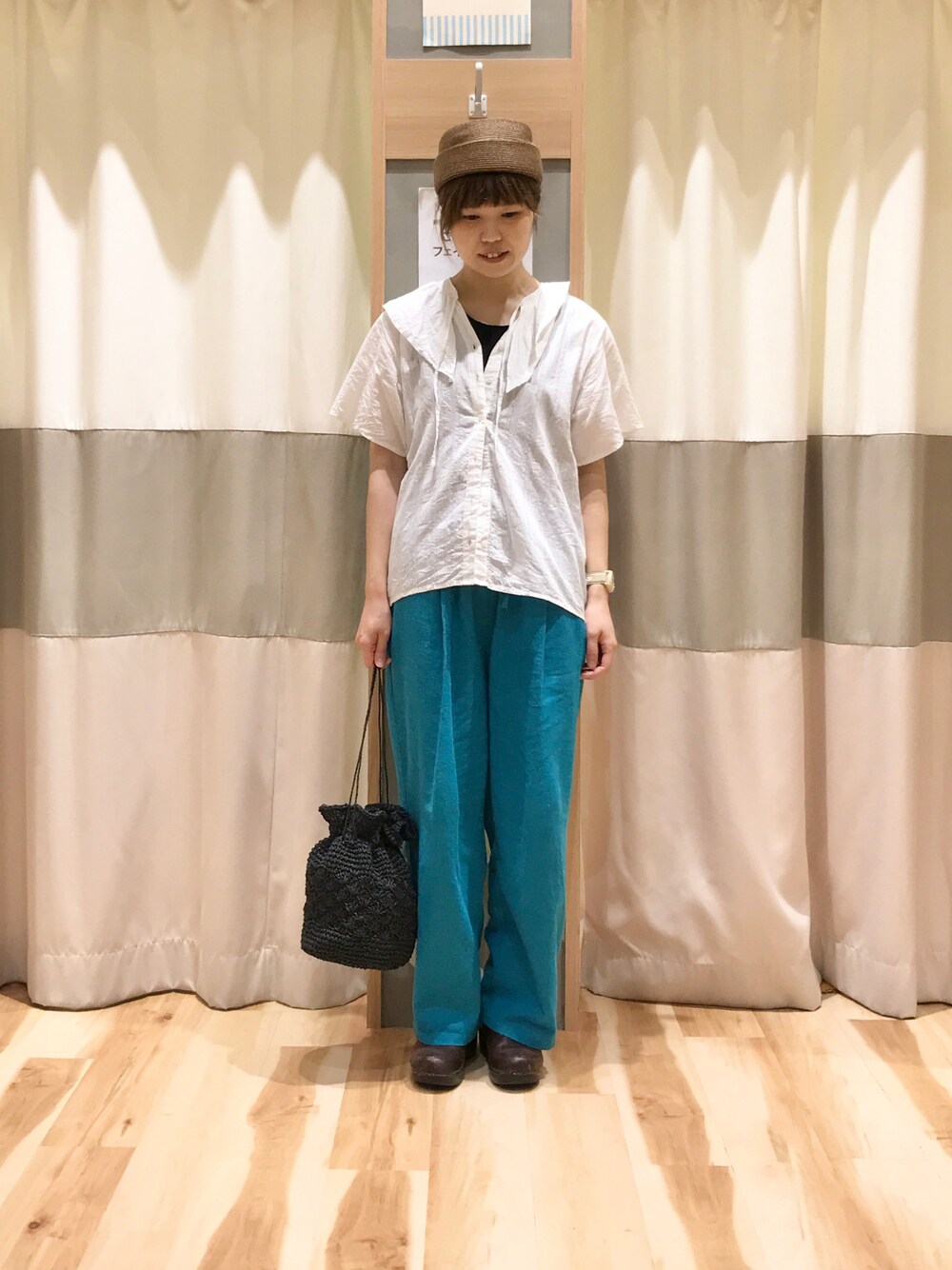 出勤コーデです。 気になっていたものの、トップスに何を持ってこようかな…と考え中で見送っていた涼しげカラーのパンツ。 襟が印象的なブラウスが入って来たタイミングで「これだ!☺️」 と思い購入しました。 今まで大きな襟のブラウスはあまり似合わなく持っていなかったのですが、 ・前開きで着られる ・Vネック ・レース無し ・逆三角形のようなシルエットの襟 というのが、甘さを抑えて着られそうでいいなと思い購入しました。 (左の襟が折れてしまっていたことに後から気付きました。😨)