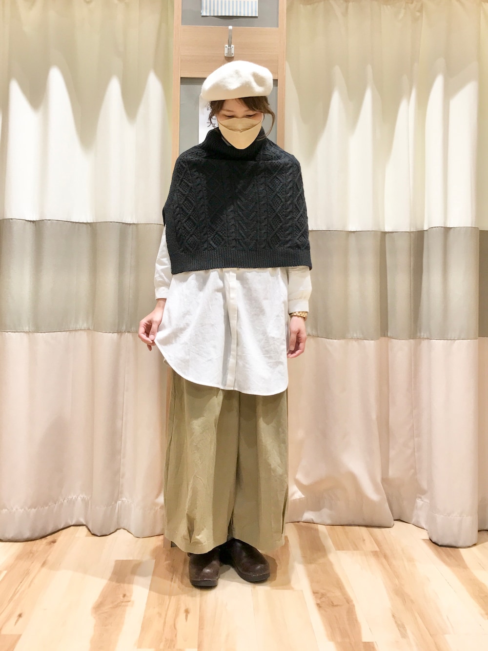 出勤コーデです。☺️ ケーブル編みが可愛いケープスヌードは、タートルネックにもなったり、スリットが片方だけ入っていたりと、オシャレを楽しめるオススメの防寒アイテムです! ピエロパンツの詳細はまたZOZOTOWNに掲載され次第更新します。