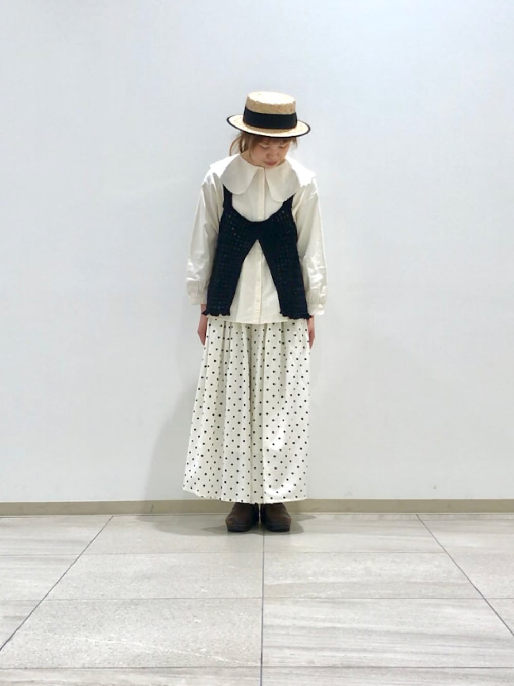 大きめの襟・透かし編み・小さめなドット柄…可愛らしいポイントが多かったので、使うカラーは意識して2色に絞って甘さを抑えました。☺️ スカートに見えますがパンツです。 ビスチェの詳細は後日更新します。←更新しました!