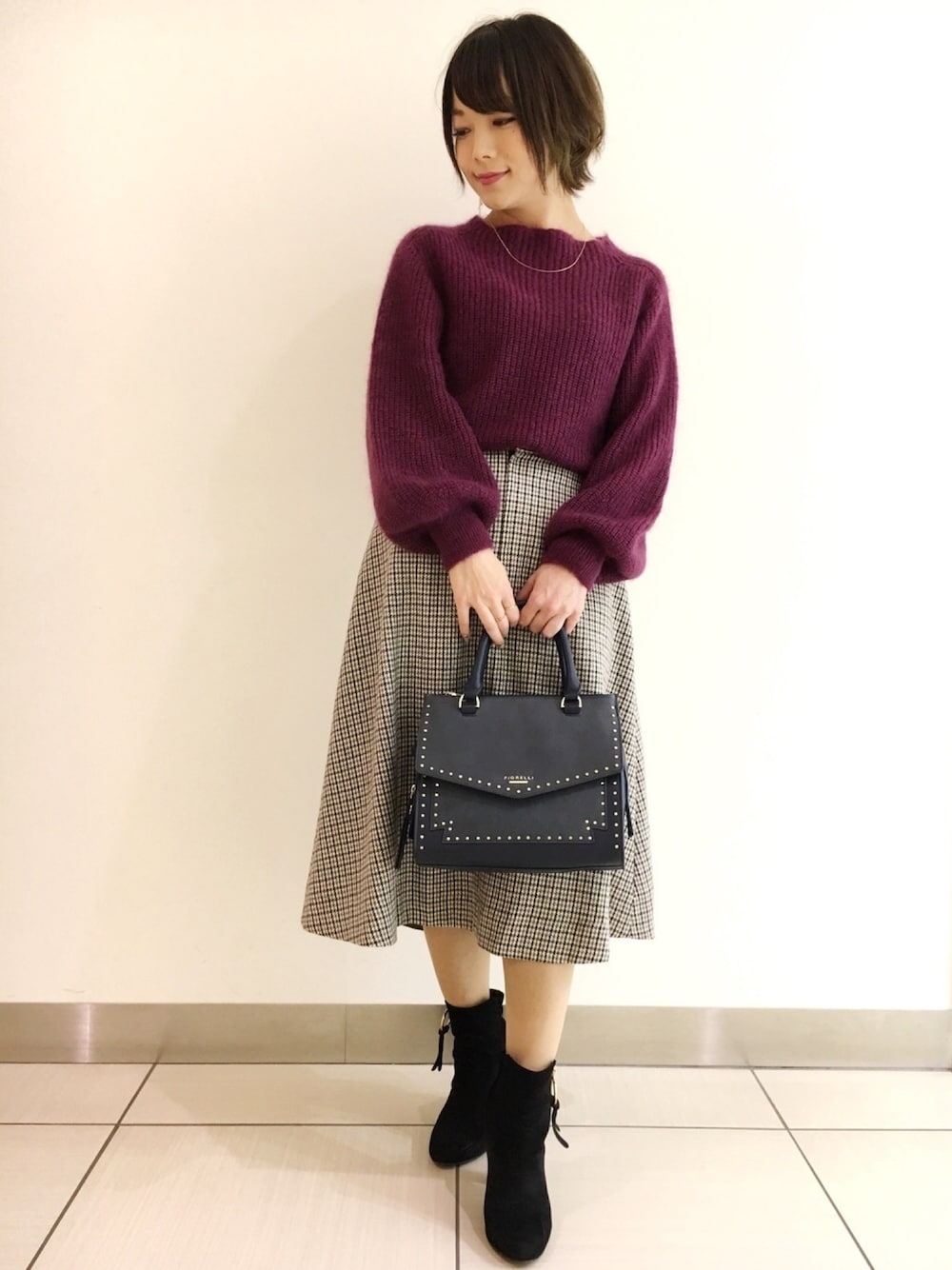 今年注目のガンクラブチェックのスカートを使ったコーディネートです♡ ボリューム袖のふんわりニットで合わせて大人ガーリーにしてみました◡̈*