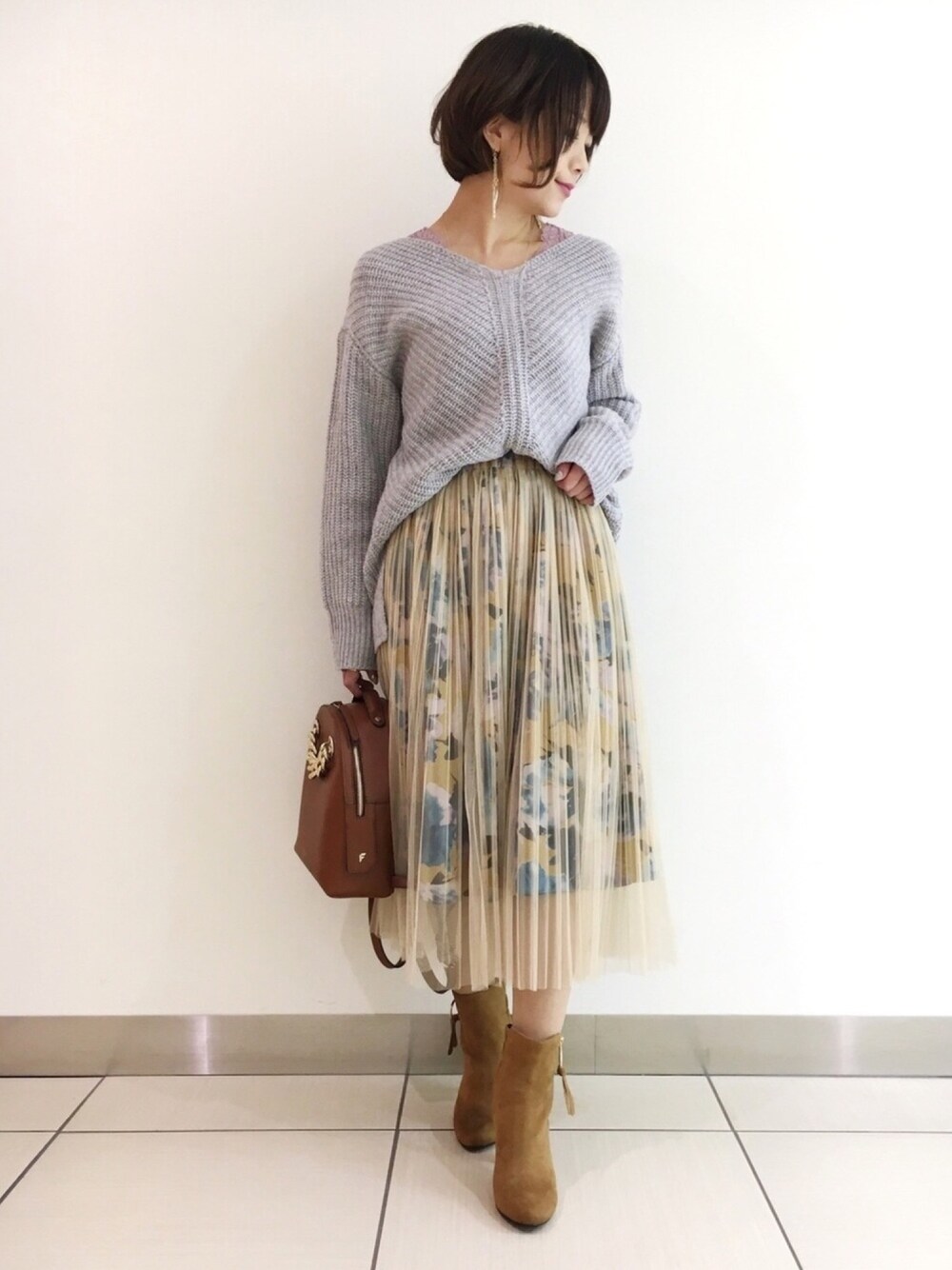 チュールの透け感でふんわり華やぐ花柄スカートはプリーツですっきりと着られます。 ゆるめのニットと合わせて柔らかな大人フェミニンなコーディネートにしてみました◡̈* カラフルな花柄なのでトップスの色選びも楽しめそうですね♪