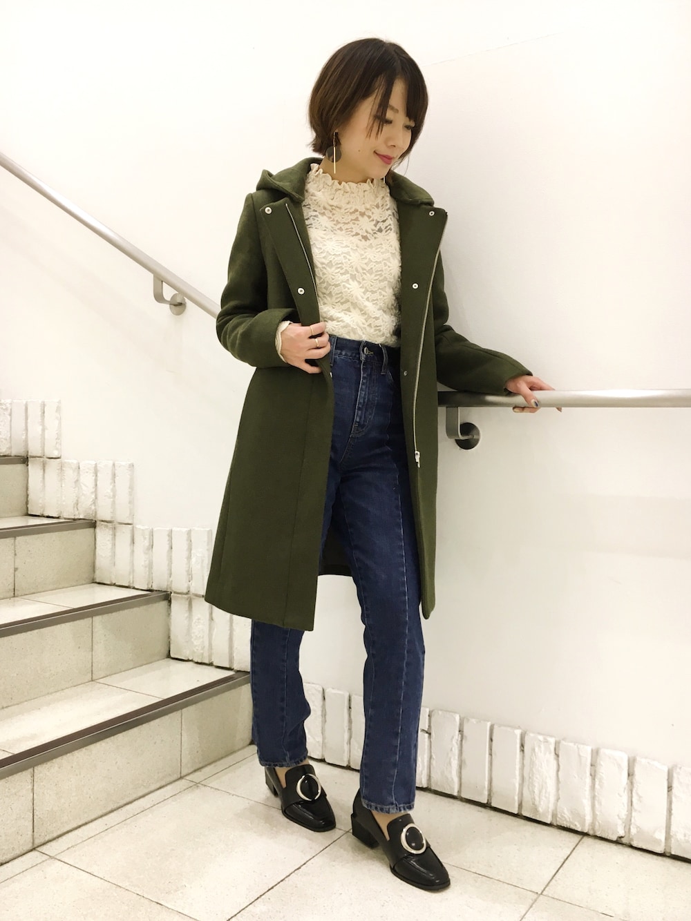 シンプルですっきりデザインのカーキのウールコートなら、カジュアルコーディネートはもちろん、レースのデザイントップスでも合わせられる着回しコートです♪ しっかり防寒しつつもデニムテーパードパンツやローファーで脱無難コーデ◡̈*