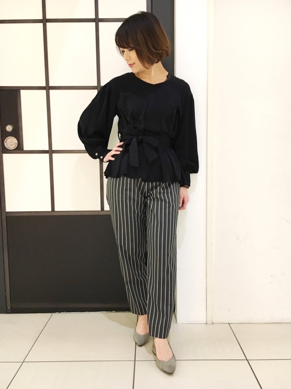 ウエストラインがリボンキュッと締まる女性らしいシルエットのブラウスを着てみました! パンツスタイルとの相性◎ 新年会にもおすすめです◡̈*