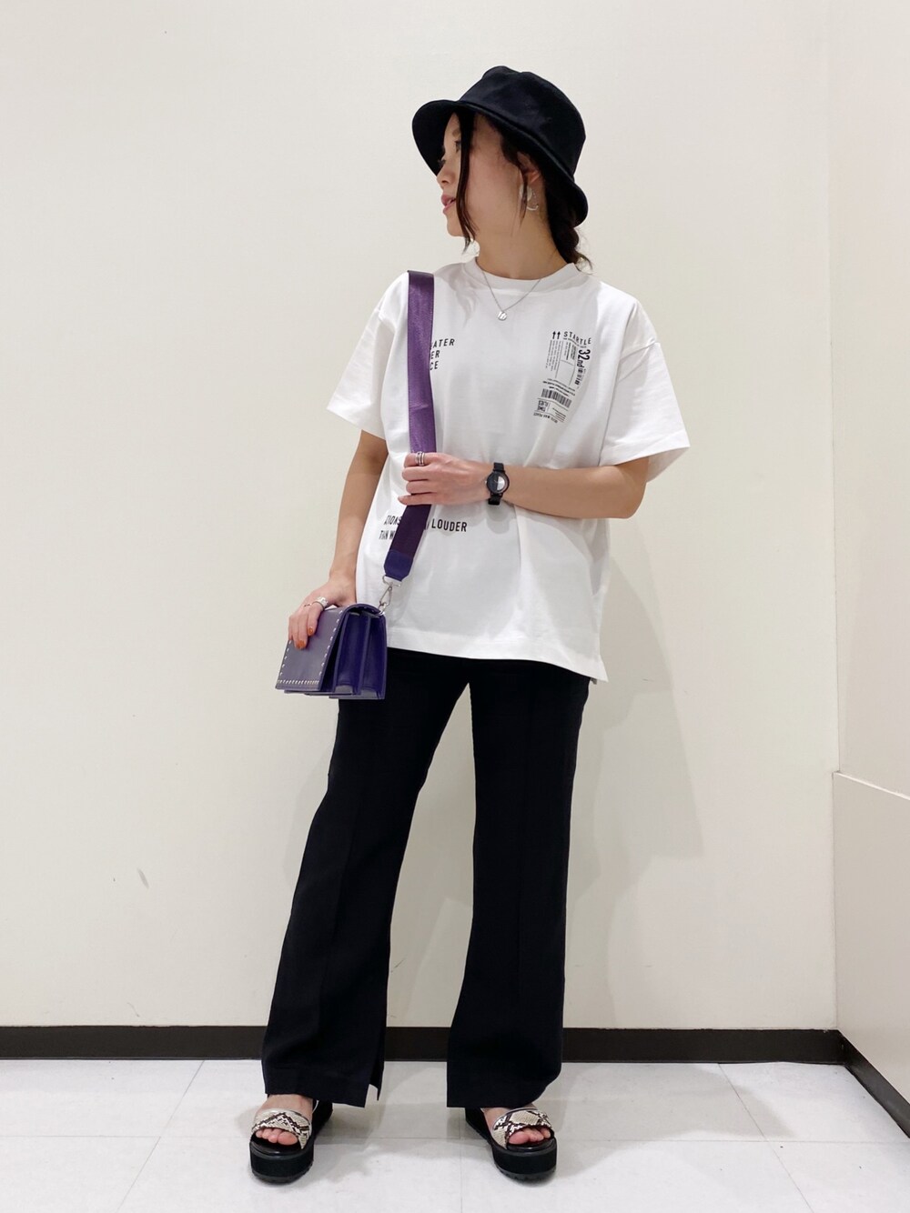 シンプルプリントTシャツは小物使いで楽しめますね🔮 私の身長でパンツアウトで着てもすっきり着られる嬉しい丈感