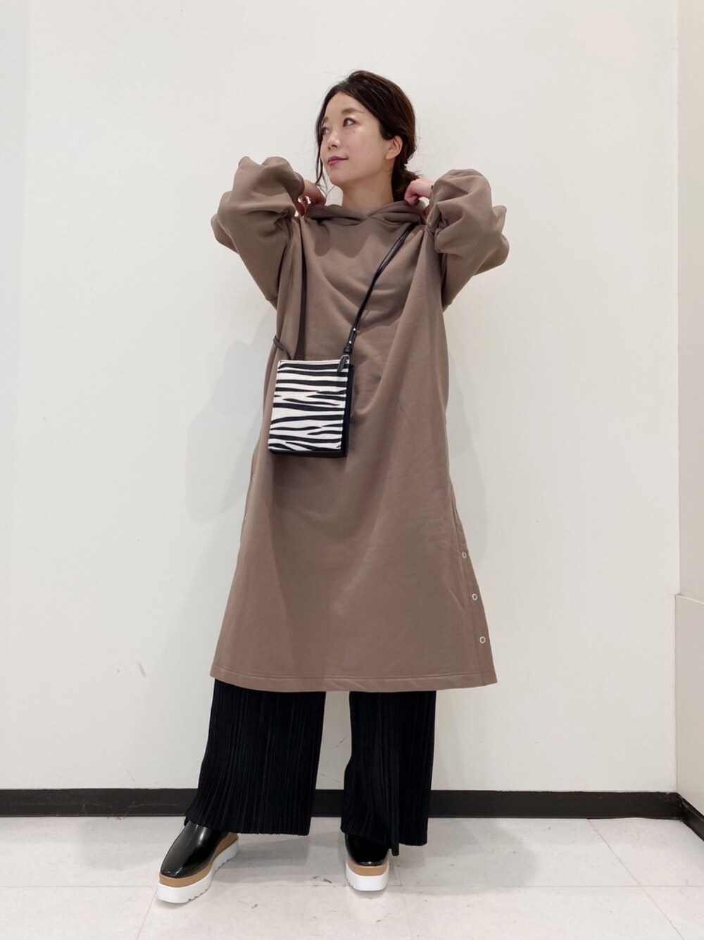 重ね着が楽しめるページのパーカーワンピース フードが大きめで刺繍の入ったバックデザインでどの角度から見てもかわいいです♪ 光沢感のあるプリーツパンツでカジュアル過ぎずに着るのがオススメです☕️