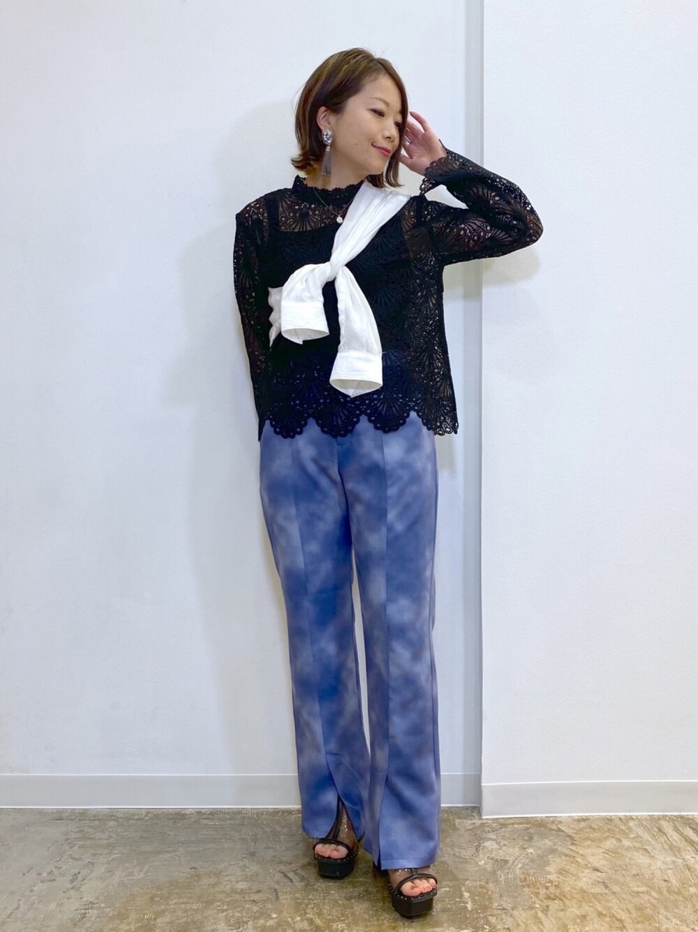 今日はお店のスタッフに選んでもらったレーストップスを使ったコーディネートです◡̈* 甘めなブラウスにパンツとシャツでかっこよさプラスしました 裾のデザインがかわいく、ショート丈なのでフレアパンツで合わせた時の脚長効果はばっちりです! STAFF BOARD▶︎Chisa