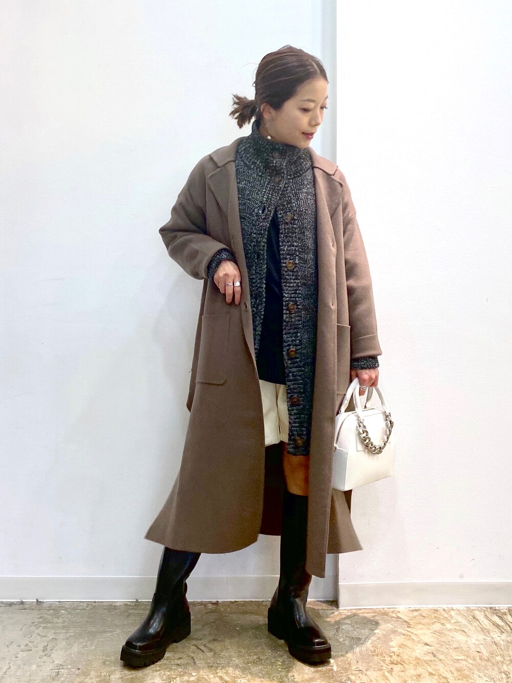 ハイネックのニットカーディガンを生かしたレイヤードスタイル ボトムはショートですっきり軽く見せます STAFF BOARD▶︎Chisa *低身長なりの大人カジュアルなスタイルリングをしています。毎日更新しているのでぜひフォローお願いします◡̈*