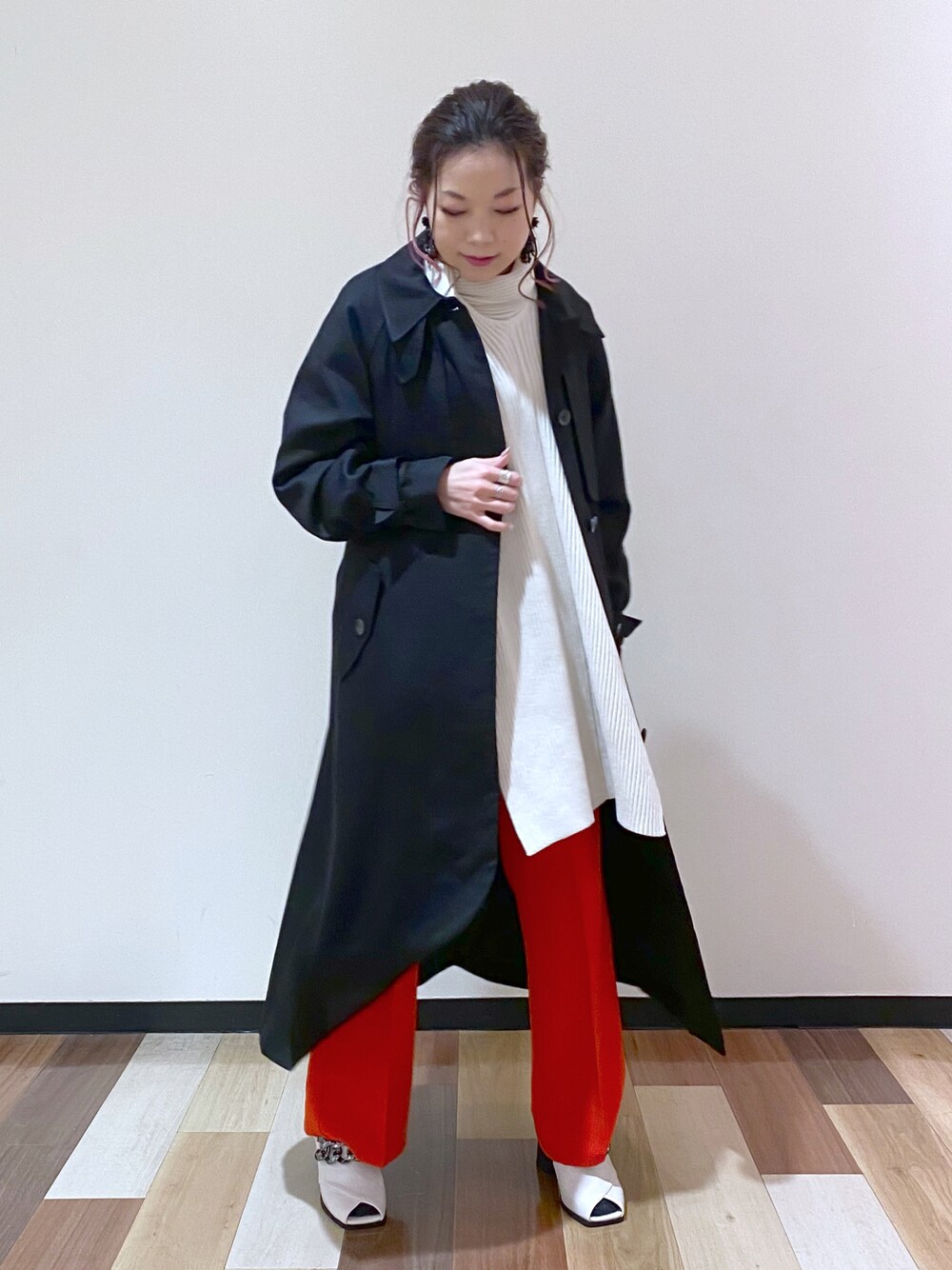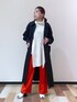 ビタミンカラーとブラックのモードカジュアルコーディネート ストール風なロングジレを合わせて今から着られる春コーディネートに トレンチコートルーズシルエットなのでロング丈でかっこよく着たい方はMサイズがおすすめです STAFF BOARD▶︎Chisa *アラフォー低身長なりの大人カジュアルスタイルを楽しんで毎日更新しています!ぜひフォローお願いします◡̈*
