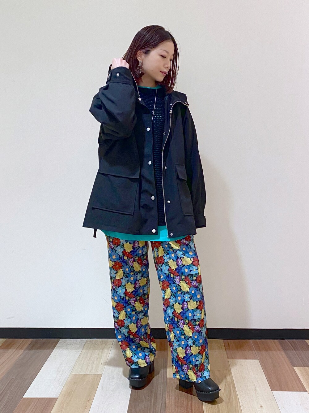 ヴィンテージ風なPOPな花柄パンツをモードカジュアルに着てみました サイドのスリットがカラーコーディネートをレイヤードで楽しめるデザインです STAFF BOARD▶︎Chisa *アラフォー低身長なりの大人カジュアルスタイルを楽しんで毎日更新しています!ぜひフォローお願いします◡̈*