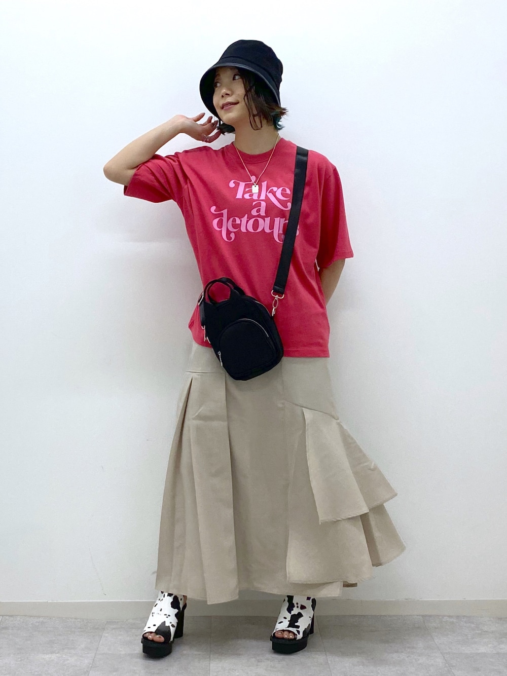 きれいめスカートにポップなロゴTシャツで夏のおでかけにおすすめなカジュアルスカートスタイル Tシャツをインしてももちろんかわいいですが、外に出してリラックススタイルで着るのもおすすめです♪ STAFF BOARD▶︎Chisa *アラフォー低身長なりの大人カジュアルスタイルを楽しんで毎日更新しています!ぜひフォローお願いします◡̈*