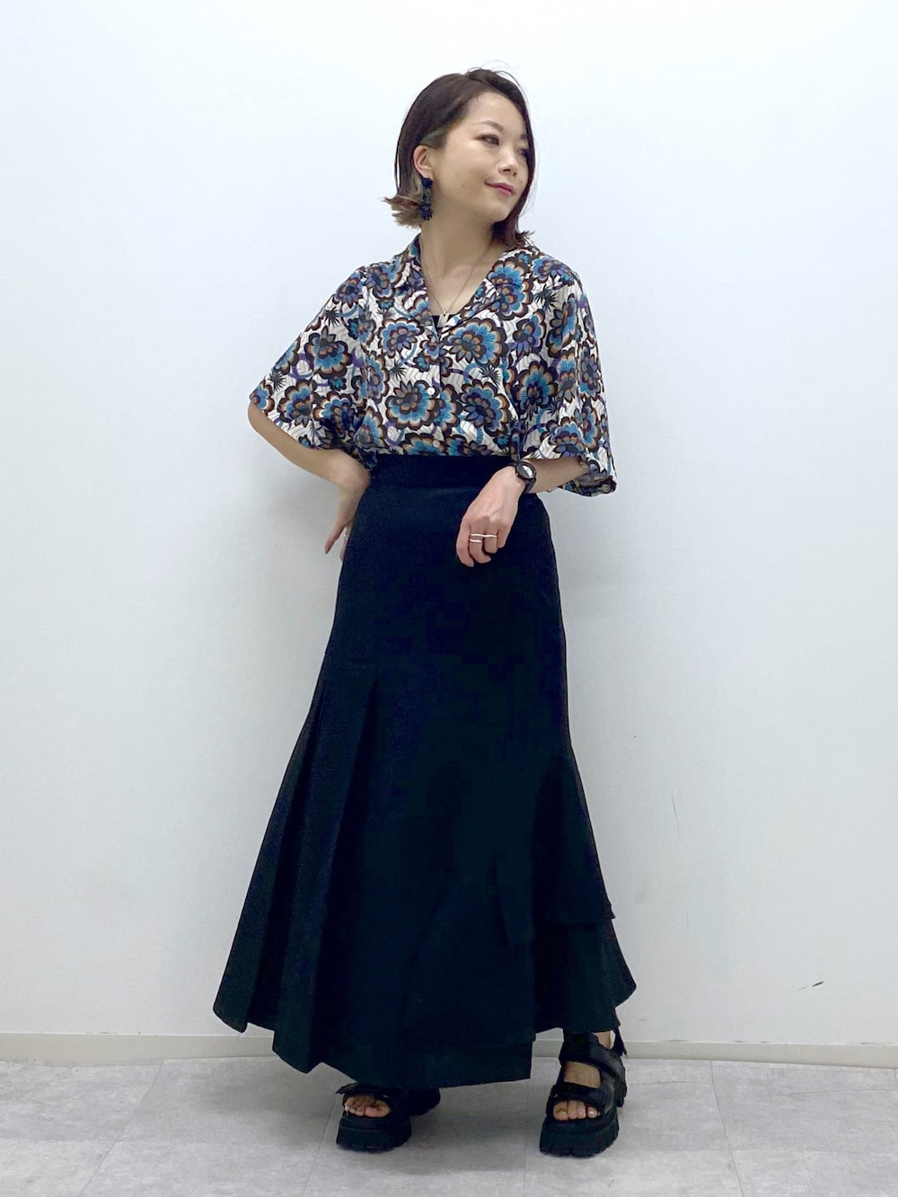 オールブラックにリゾート感をプラスしたスカートスタイル ガーリーなシルエットのスカートがモードに着られます シャツはインスタイルでも前開きでもどちらでも◎ STAFF BOARD▶︎Chisa *アラフォー低身長なりの大人カジュアルスタイルを楽しんで毎日更新しています!ぜひフォローお願いします◡̈*