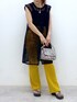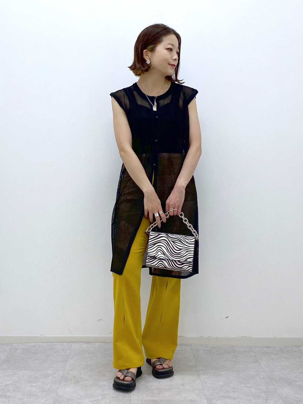 イエローカラーが映えるメッシュニットとのレイヤードスタイル 黒でもメッシュニットなら夏でも重たく見えず透け感もきれいです 程よくストレッチが効いたパンツでスリットのデザインも控えめで取り入れやすいですよ🟡 STAFF BOARD▶︎Chisa *アラフォー低身長なりの大人カジュアルスタイルを楽しんで毎日更新しています!ぜひフォローお願いします◡̈*