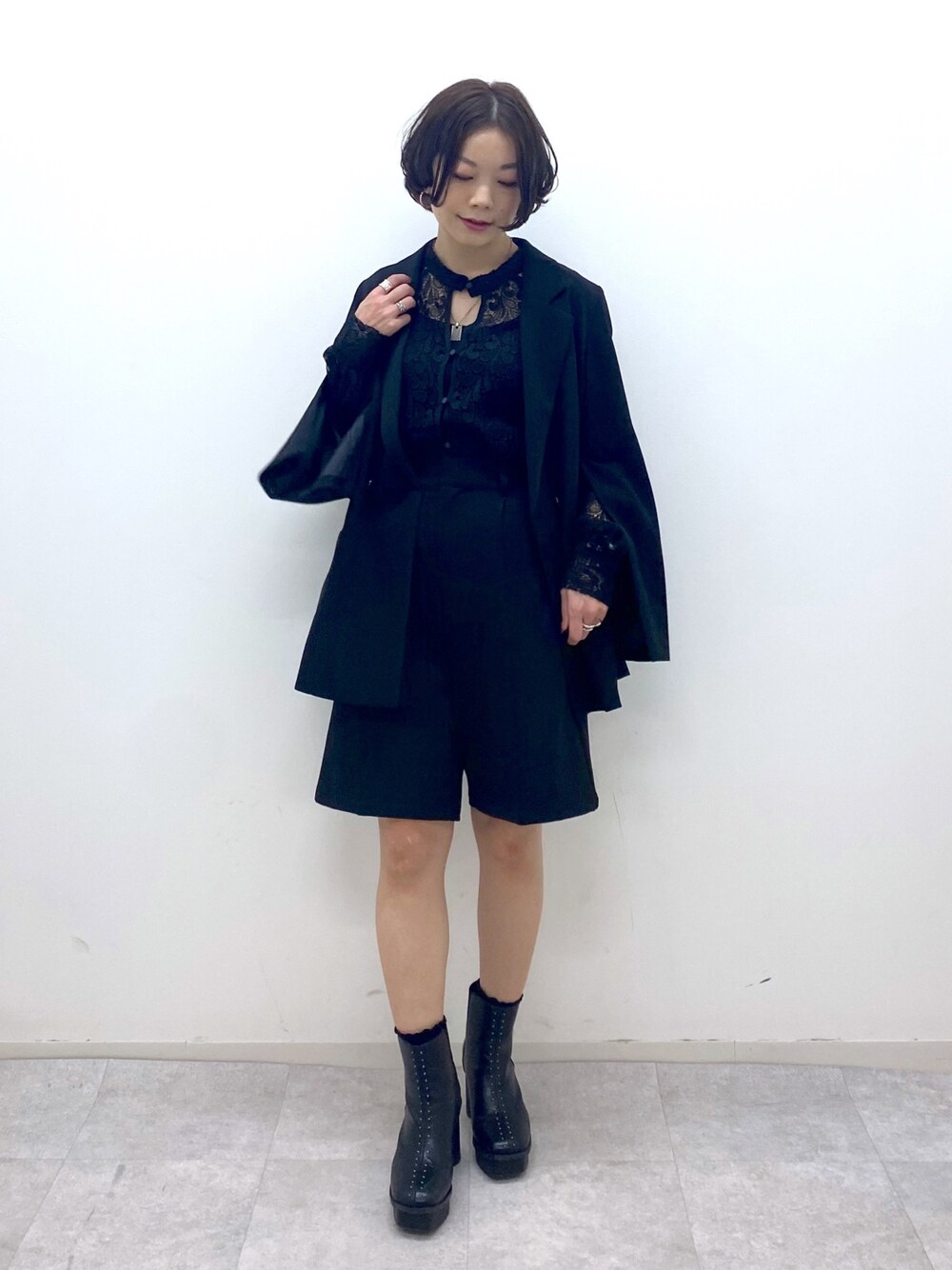 オールブラックのセットアップスタイル レースのブラウスで印象軽く、袖口からチラッと見せるレースがワンポイントに 全色集めたいくらいこのジャケットかわいいです♪ STAFF BOARD▶︎Chisa *アラフォー低身長なりの大人カジュアルスタイルを楽しんで毎日更新しています!ぜひフォローお願いします◡̈*