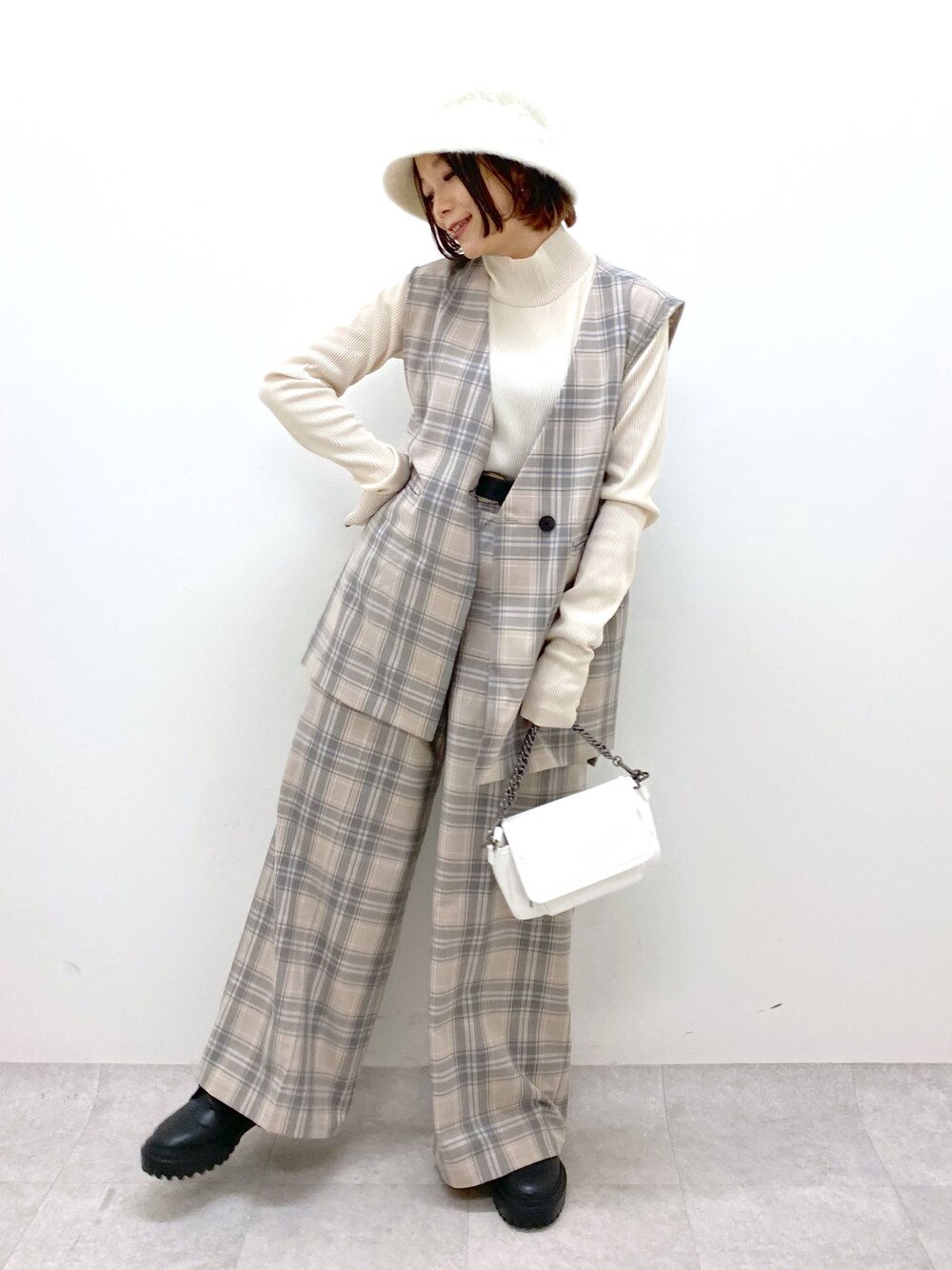 淡めなチェックのセットアップスタイル 白でまとめてガーリーな印象に パンツのたっぷりワイドなシルエットが今年らしくて個人的にお気に入りポイントです(ベルトでぐいっと上げると丈もいけましたありがたい) STAFF BOARD▶︎Chisa *アラフォー低身長なりの大人カジュアルスタイルを楽しんで毎日更新しています!ぜひフォローお願いします◡̈*