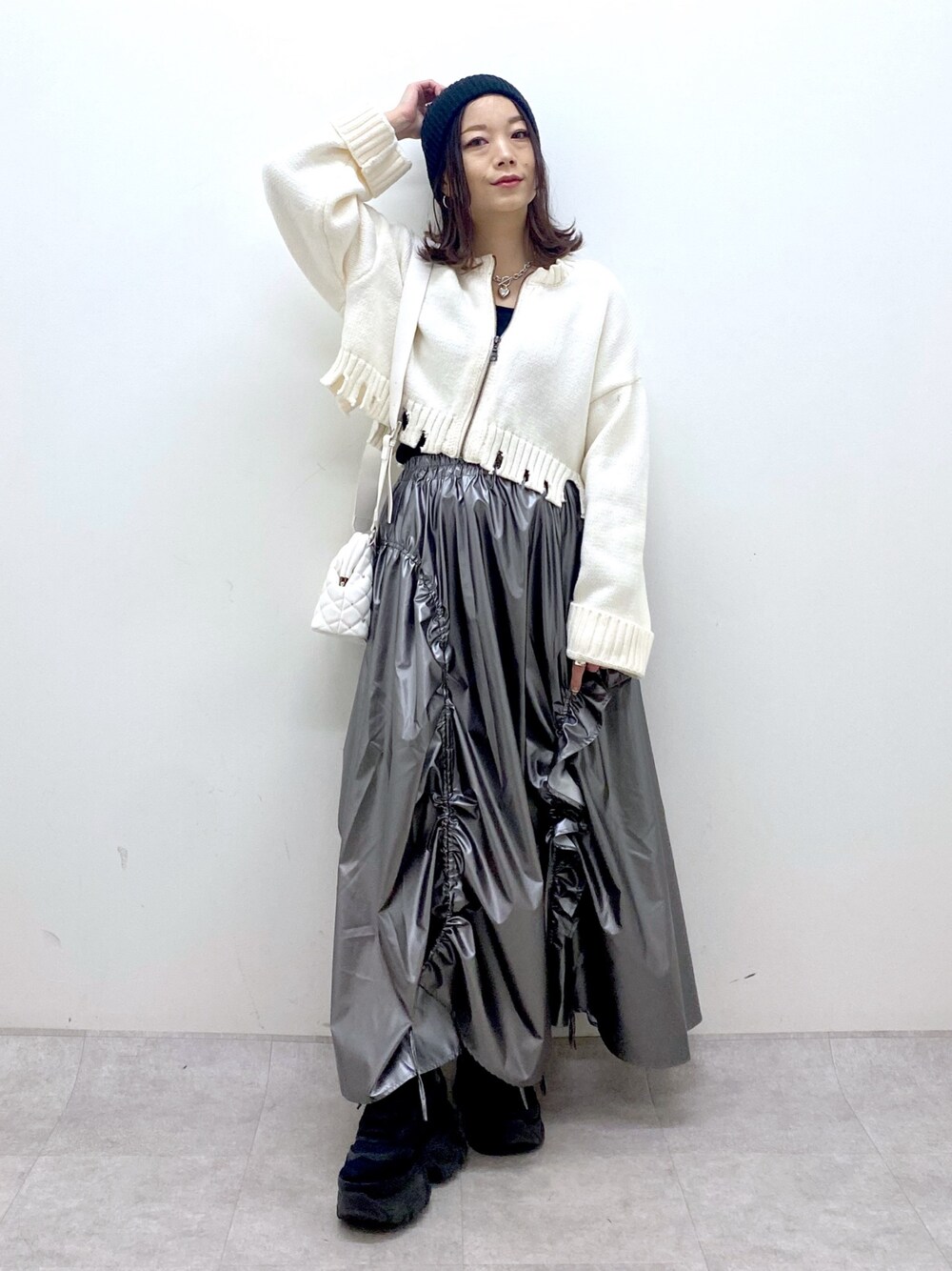 キラキラ素材は小物使いでカジュアルダウン  ̄ ̄ ̄ ̄ ̄ ̄ ̄ ̄ ̄ ̄ ̄ ̄ ̄ ̄ ̄ ̄ ̄ ̄ ̄ ̄ ̄ 【トップス】 ニットの着膨れ感じが苦手な方におすすめしたいショート丈&首周りすっきりのフルジップのカーディガン 着回し万能です🙌 【ボトムス】 トレンドのメタリック素材のスカート 張り感が高見えするので他の人と差をつけられる一癖アイテムです STAFF BOARD▶︎Chisa *アラフォー低身長なりの大人カジュアルスタイルを楽しんで毎日更新しています!ぜひフォローお願いします◡̈*